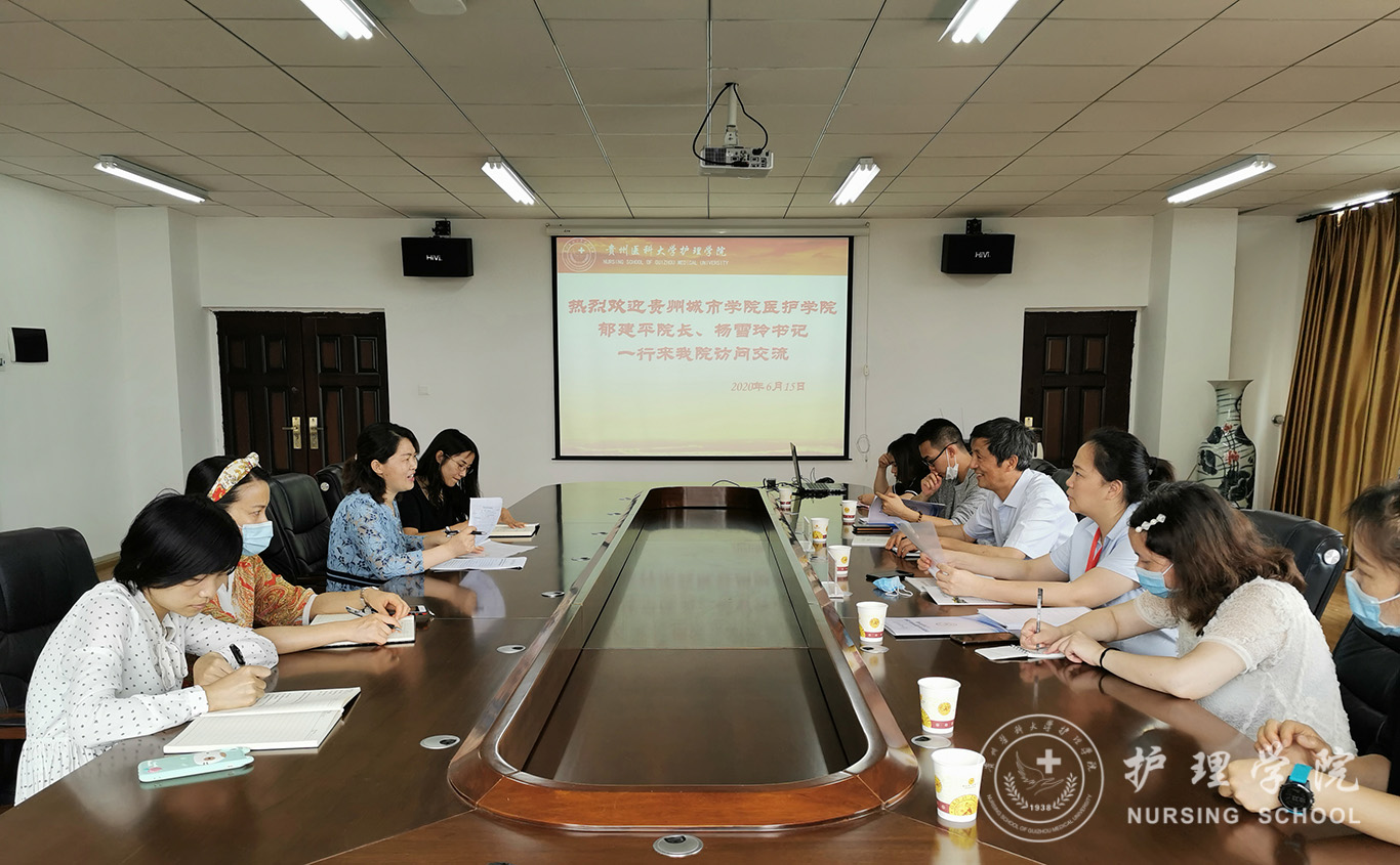 6月15日,贵州城市职业学院医护学院郁建平院长、杨雪玲书记一行七人来我院交流学习,BEAT365英国官网在百川楼5楼会议室召开座谈会热情接待了来访人员,会议由副院长刘志燕主持,教学科研管理科、护理学技能实验室、教研室等部门教师参加了此次交流。