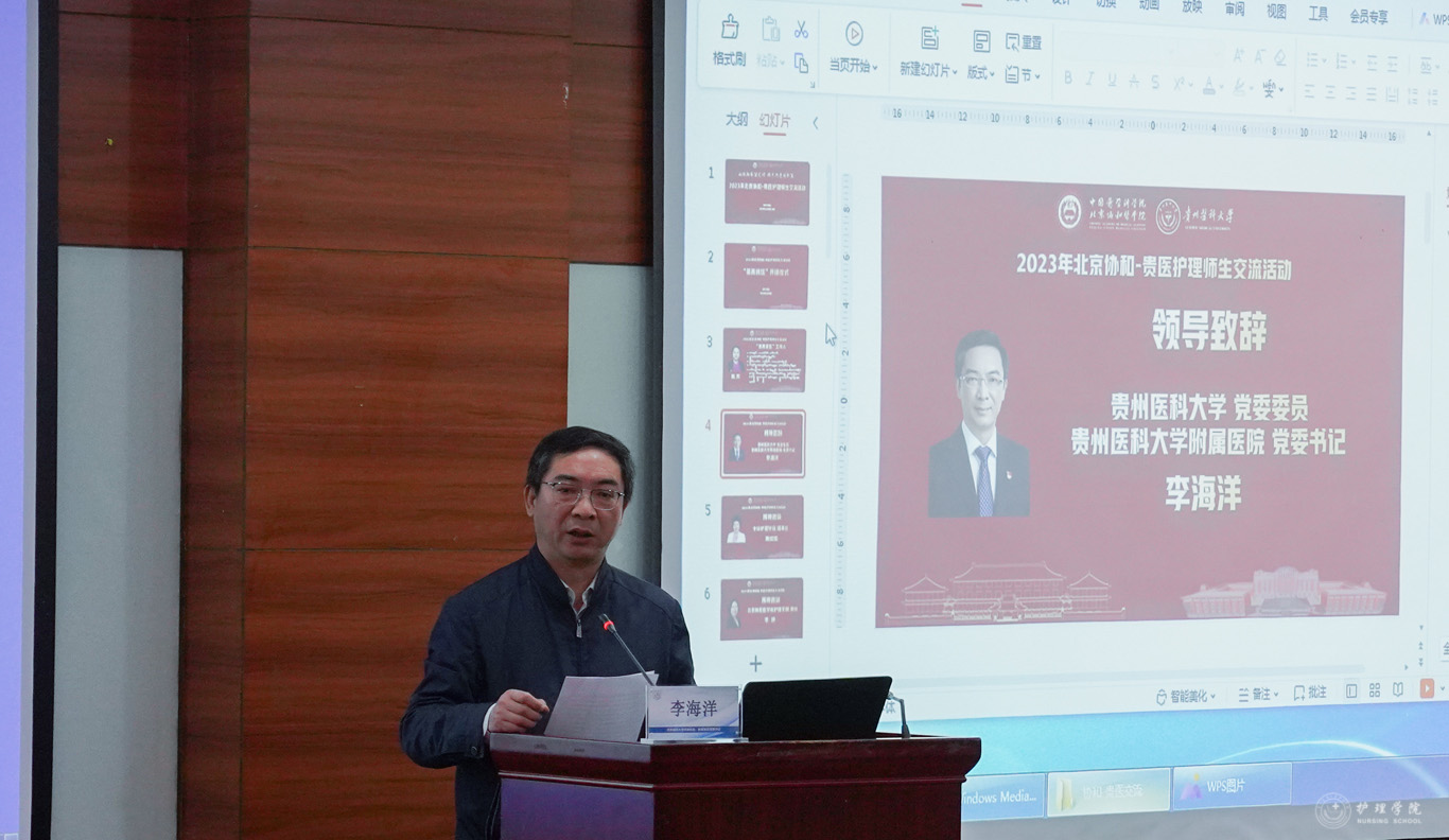 校党委委员、附属医院党委书记李海洋出席“葆真讲坛”开讲仪式并致辞,他对北京协和医学院BEAT365英国官网师生一行的到来表示热烈欢迎,回顾北京协和医学院对我校“医教研管”全面的帮扶,对两院搭建交流学习平台给予高度的赞赏与肯定,并就今后的帮扶指导提出期望。