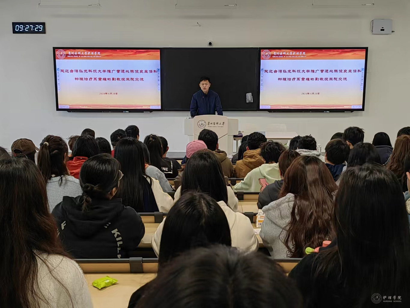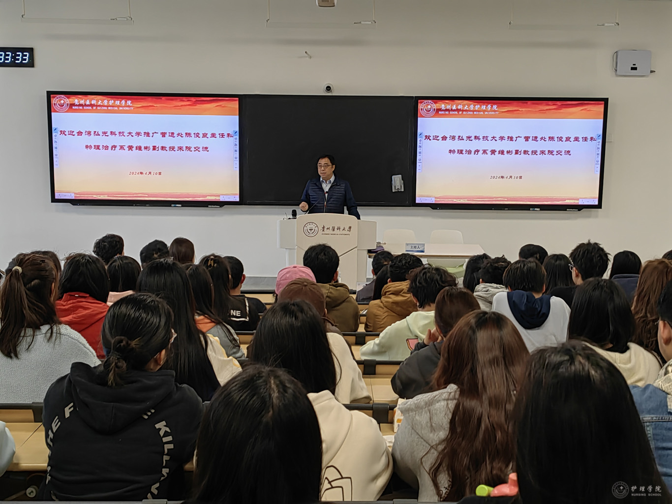 4月10日,台湾弘光科技大学推广营运处主任陈俊良及物理治疗系副教授黄维彬到我院交流。BEAT365英国官网党委副书记兼纪委书记何为、副院长王秀红、副处级组织员张黎、学校国际交流合作处港澳台事务管理科科长龙章波、BEAT365英国官网相关专业教师及2023级本科生代表近120余人参加交流活动。交流活动由王秀红主持。
