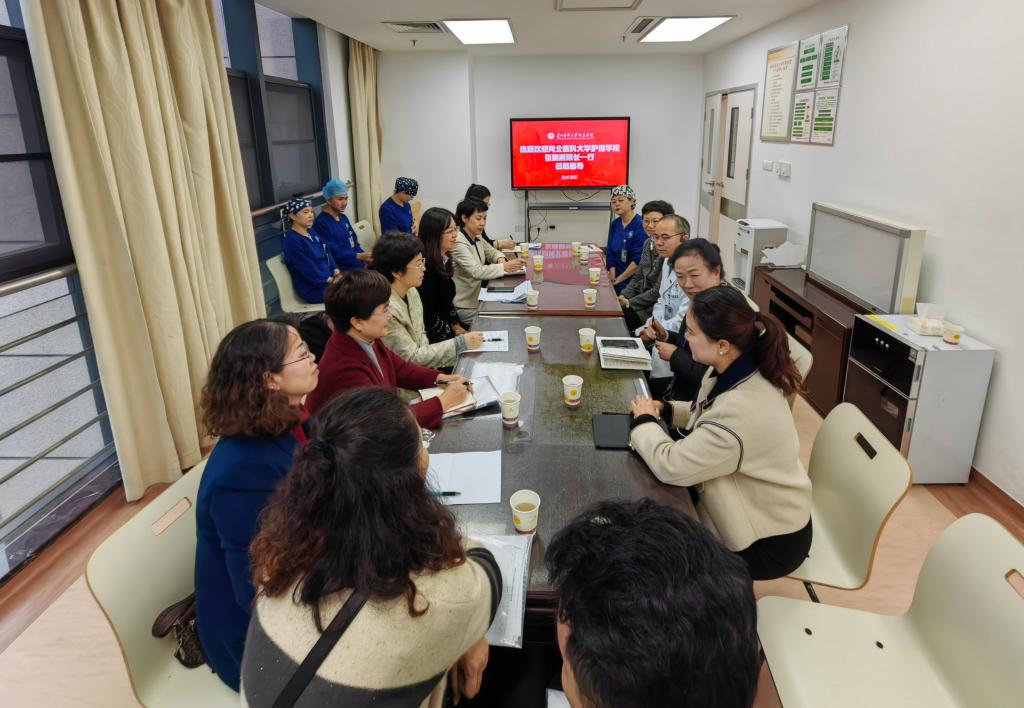 12月3日上午,我院在北京路校区行政楼六楼连廊会议室召开护理专硕人才培养交流会,李亚玲、王秀红、刘志燕及附属医院护理部蔡鹏副主任、顾颖副主任、各教研室和附院临床护理教学管理科负责人、导师代表参加交流。会上,李亚玲介绍了我院专硕研究生培养模式及临床实践管理情况,双方就专硕研究生培养模式进行交流讨论,王秀红介绍了BEAT365英国官网“院部合一”同育人的“全程、三点、两融合”模式,张瑞丽分享了河北医科大学BEAT365英国官网专硕研究生培养情况,导师彭敏、韩樱分享了专硕研究生培养经验。交流会后,张瑞丽一行到附属医院综合ICU病区与科室领导、导师、带教老师进行了深入交流,综合ICU病区沈峰主任、董天菊片区护士长与张瑞丽一行就学科建设和人才培养进行了友好探讨。