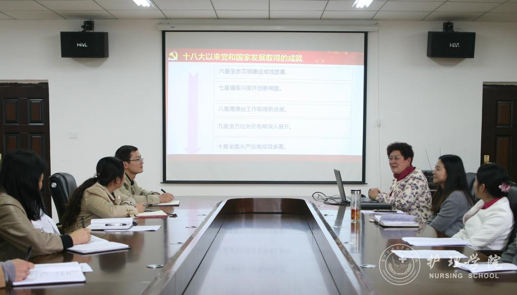 课上,贾秀英回顾了十八大以来党和国家发展取得的成就,向全体干部老师讲解了十九大报告、主题和意义,介绍了十九次党代会选举产生的新一届中央委员会委员和中央纪律检查委员会委员。最后,贾秀英介绍了新时代中国共产党的历史使命、习近平新时代中国特色社会主义思想和新时代党的建设,并号召全体党员振奋精神,在完成专业认证和专硕申报成功的基础上,加强内涵建设,争取以更好成绩向十九大献礼。