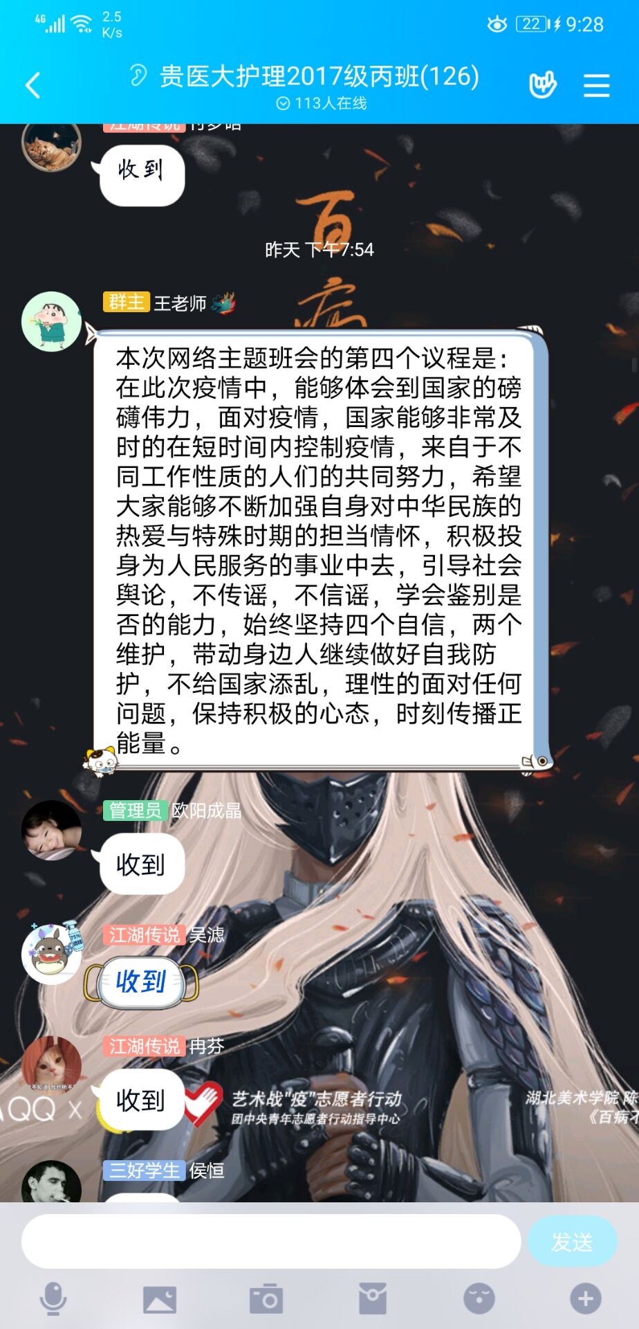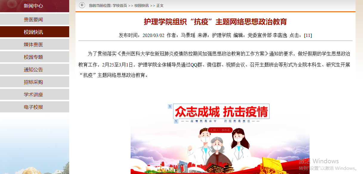 在学校和学院的领导和指导下,辅导员们立足本职工作,情系学生安危,充分利用互联网筑起与学生之间保持信息畅通的桥梁,及时为学生送去温暖:排查并重点关注湖北籍、有湖北旅居史学生;每日组织学生通过“今日校园”APP打卡的方式了解学生现居地和身体健康状况;对疫情严重地区学生进行心理辅导;上报疫情期间学生相关数据;协调毕业生实习就业相关事宜;召开网络视频班会传达学校的教学和管理规定、进行网络思想政治教育;心系毕业生就业工作,制作毕业生就业宣传推文,召开毕业生实习管理暨就业指导主题班会;积极组织撰写宣传、科普推文,通过“贵医护院”微信公众号普及新型冠状病毒肺炎防控知识,全方位引导学生正确对待疫情,做到不信谣、不传谣、自觉居家;学院团委积极组织开辟“贵医护理校友抗疫先进事迹”系列报道及 “南丁格尔志愿者抗疫行动”系列报道,宣传BEAT365英国官网师生及校友抗疫事迹,传递正能量,帮助在校生正确认识护理专业,提升专业认同感的同时增加专业自豪感,树立投身医疗事业,为人民服务的远大志向。