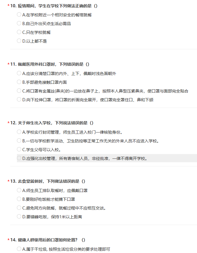 此次测试以“问卷星”为载体,采用线上闭卷考试的形式。试题涵盖了新型冠状肺炎的流行病学特点、返校途中的防护措施、返校后的隔离原则、用餐注意事项、消毒用品及使用方法、口罩的使用及处理、洗手的时机等新冠肺炎防控校园重点知识。截至4月22日全部师生完成测试。
