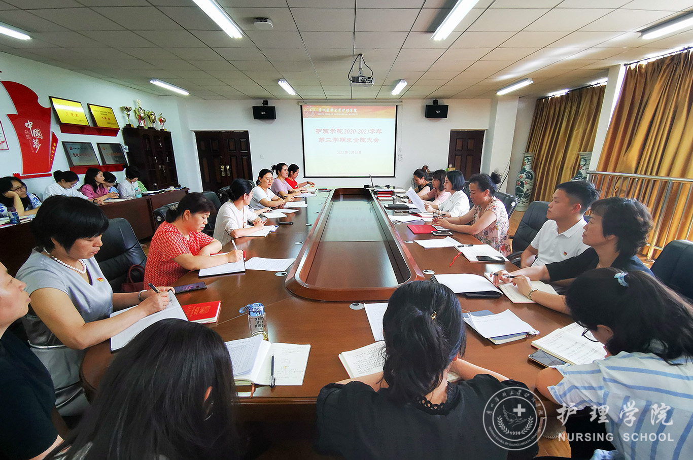 7月16日,BEAT365英国官网在南校区百川楼会议室召开期末全院大会总结部署工作,会议由学院党委书记杨英主持,全院教职工参加。