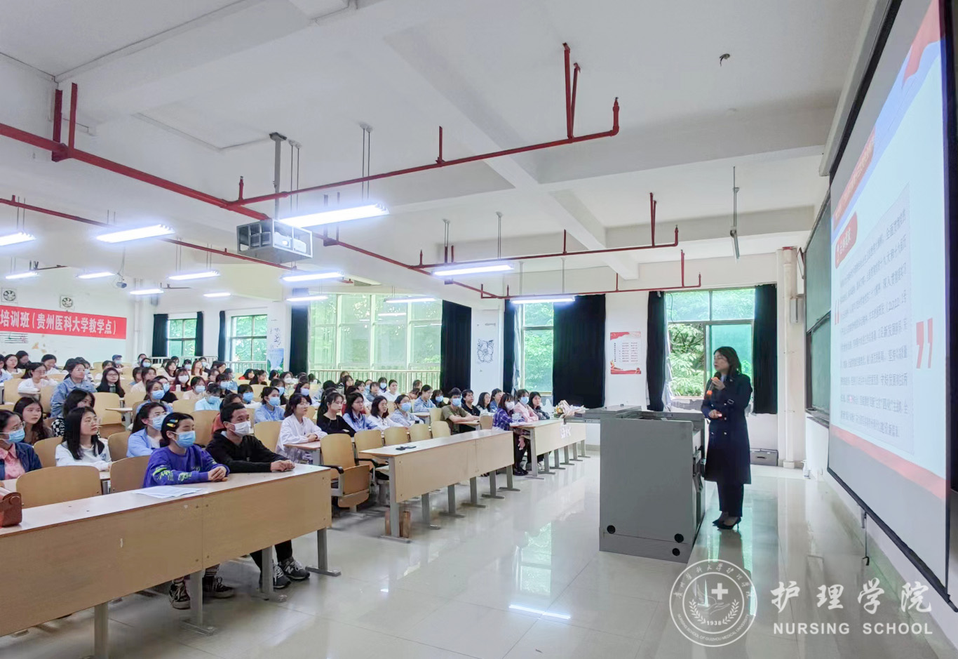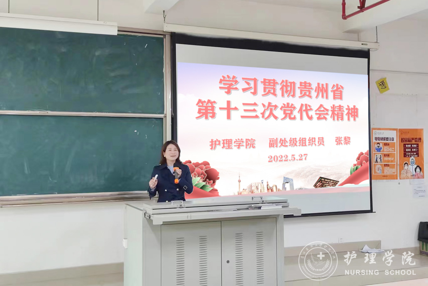 5月27日,为深入学习贯彻中国共产党贵州省第十三次代表大会精神,BEAT365英国官网党委委员、副处级组织员张黎在北校区4201教室为护理学2019级甲班和学院第12期发展对象培训班学员进行了大会精神宣讲。