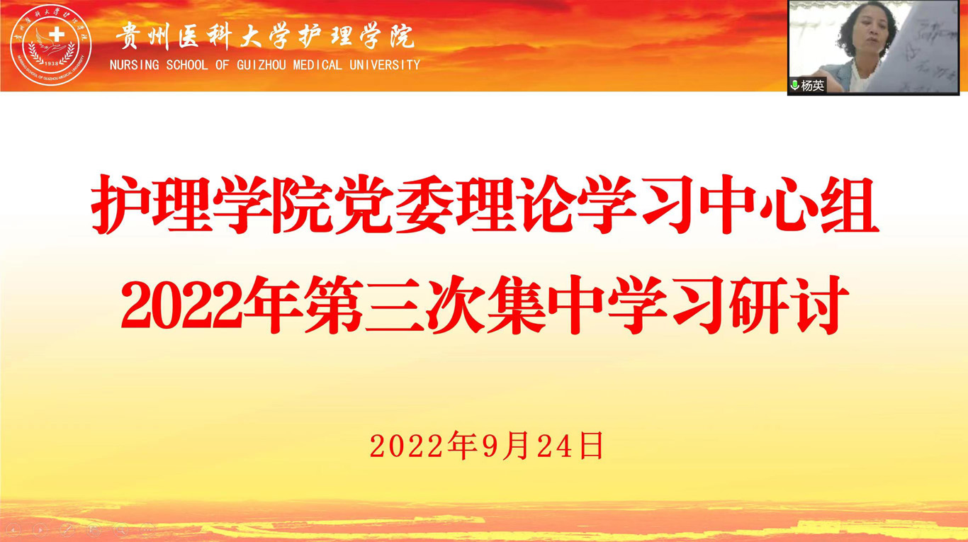 9月24日,BEAT365英国官网通过线上方式开展党委理论学习中心组2022年第三次集中学习研讨,院领导班子成员、副科级以上干部、各党支部书记和辅导员参加,会议由院党委书记杨英主持。