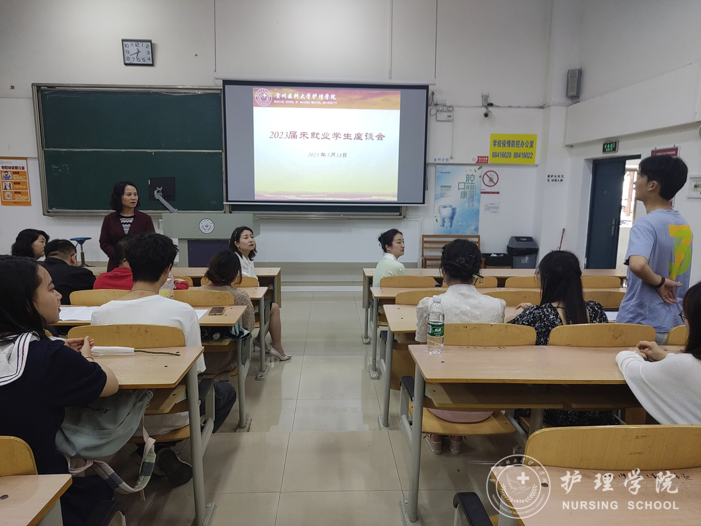 5月18日,为鼓励2023届毕业生积极就业,引导毕业生树立正确的就业观念,BEAT365英国官网在北校区4101教室召开2023届未就业学生座谈会。BEAT365英国官网党委书记杨英、副院长刘志燕、副处级组织员张黎、全体辅导员及部分2023届未就业毕业生代表参加了此次座谈会,会议由正科级组织员曾敏主持。