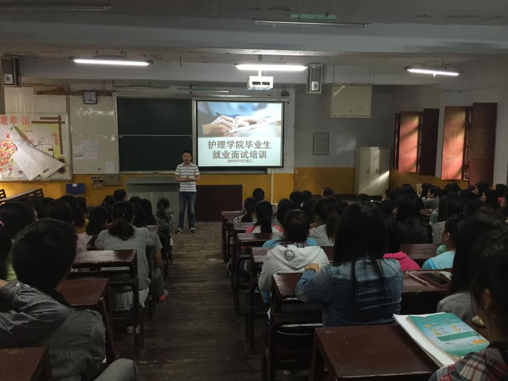 会上,陈轲老师为同学们详细介绍了贵医附院护理行业现状,贵医附院对护理人员的招聘要求,讲解了应聘工作的流程等,他强调大学毕业生要想在求职择业竞争中处于有利地位,除了必须具备厚实的从业基础和专业特长,还要掌握求职择业的策略、方法和技巧,最后陈老师对面试环节的自我介绍进行了示范和要求。培训中老师诙谐幽默的讲解,赢得同学们阵阵掌声,通过此次培训会,消除了同学们对面试的疑惑,相信同学们受益匪浅。
