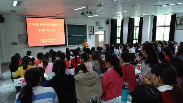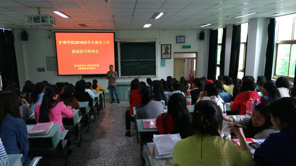 为了加强我院2016届毕业生就业工作,2016年4月21日,我院在北校区3301教室举行了一场别开生面的毕业生工作面试技巧培训会,会议邀请了贵医附属医院组织人事处陈柯老师给毕业生做了简要培训,会议由学生科科长曾敏老师主持,2016届全体毕业生参加了本次培训会。