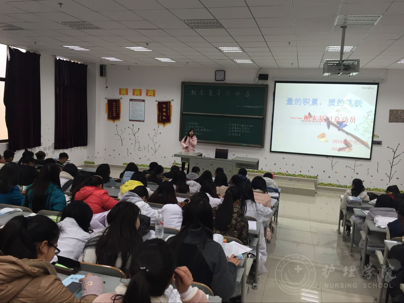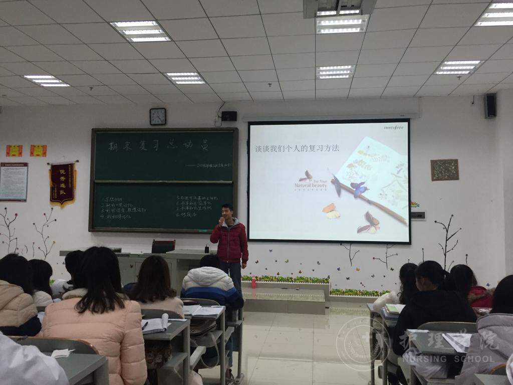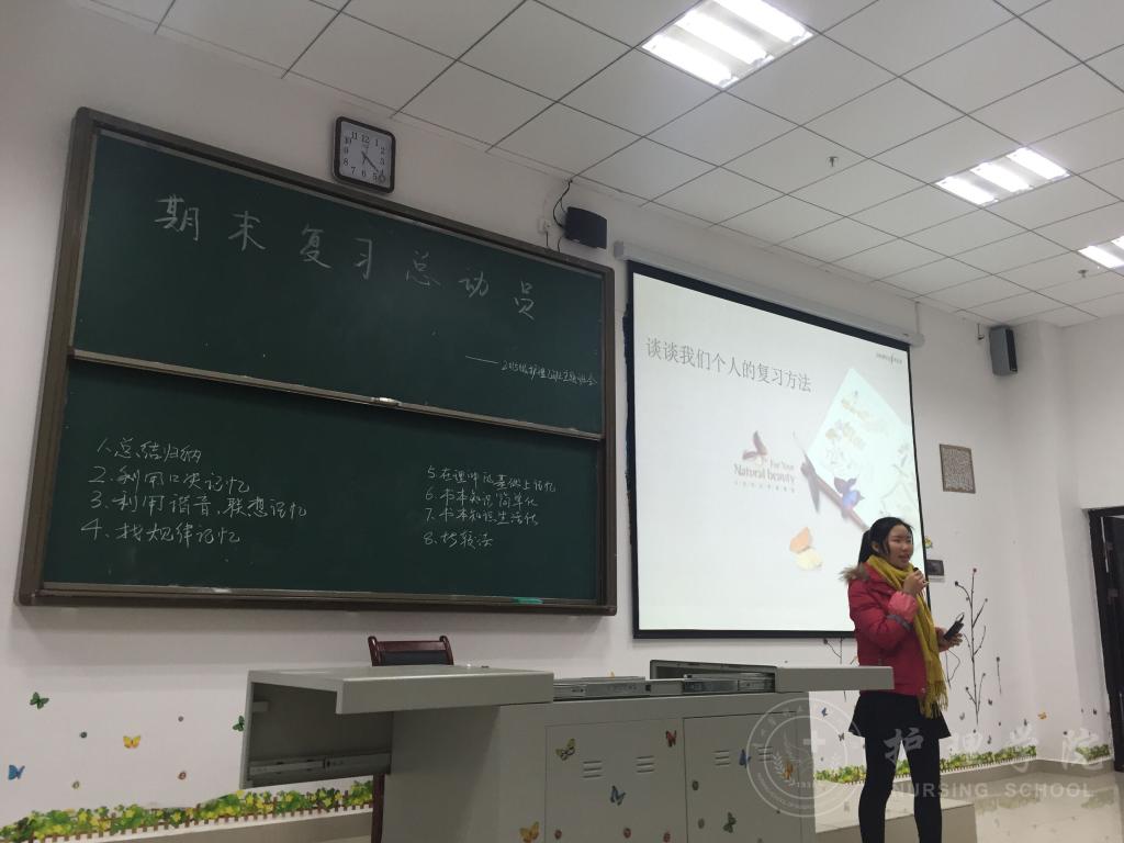 12月19日下午4:30,BEAT365英国官网2015级护理乙班在南校区4407教室开展了以“量的积累,质的飞跃——期末复习总动员”为主题的班会。此次班会由班主任老师李红主持,2015级护理乙班全体同学参加,分两个环节进行。