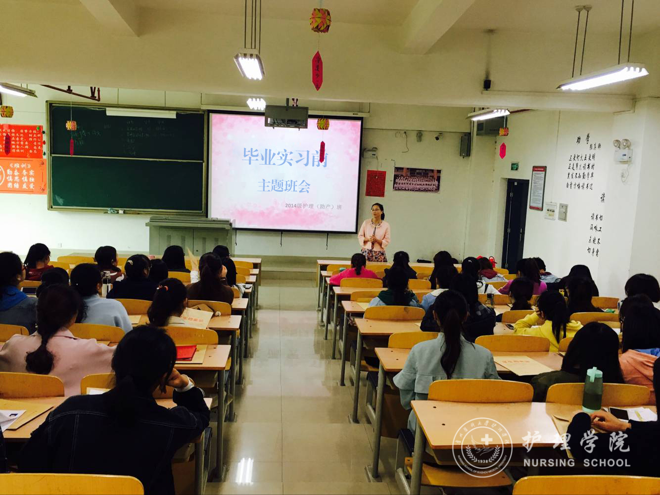 4月12日,BEAT365英国官网在北校区4401教室毕业实习前主题班会, 2014级护理学(助产)专业的班主任徐锟老师主持了此次班会, 2014级护理学(助产)的全体同学参加。