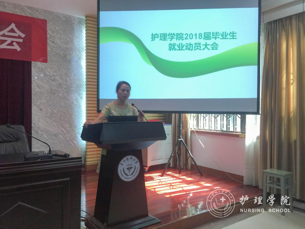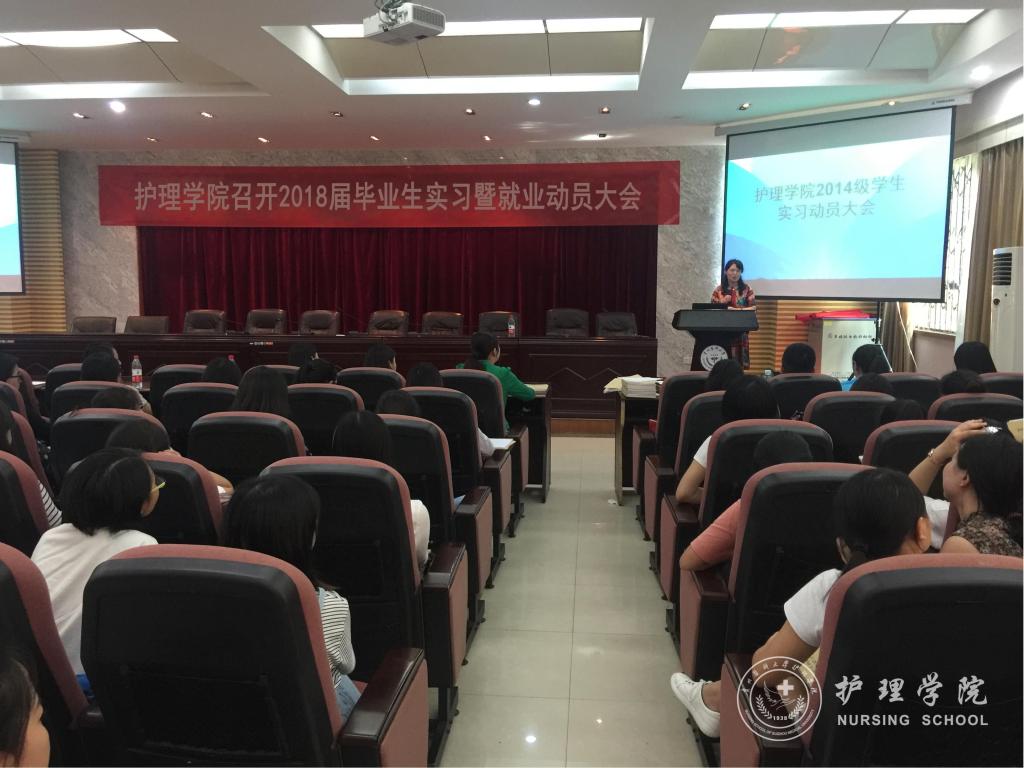 为帮助同学们更深刻地理解护理专业内涵、促进学生充分就业、保障2018届毕业生实习工作顺利开展。7月3日下午,BEAT365英国官网在北校区道德讲堂召开BEAT365英国官网2018届毕业生实习暨就业动员大会。BEAT365英国官网党委副书记杨英、副院长刘志燕、学生科科长曾敏、生产实习科科长柳忠燕、优秀毕业生代表钱兰芳、杜伟、辅导员李颖及2014级全体同学参加了此次会议。会议由学生科科长曾敏主持。