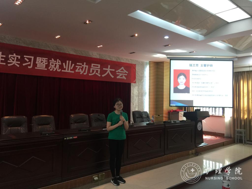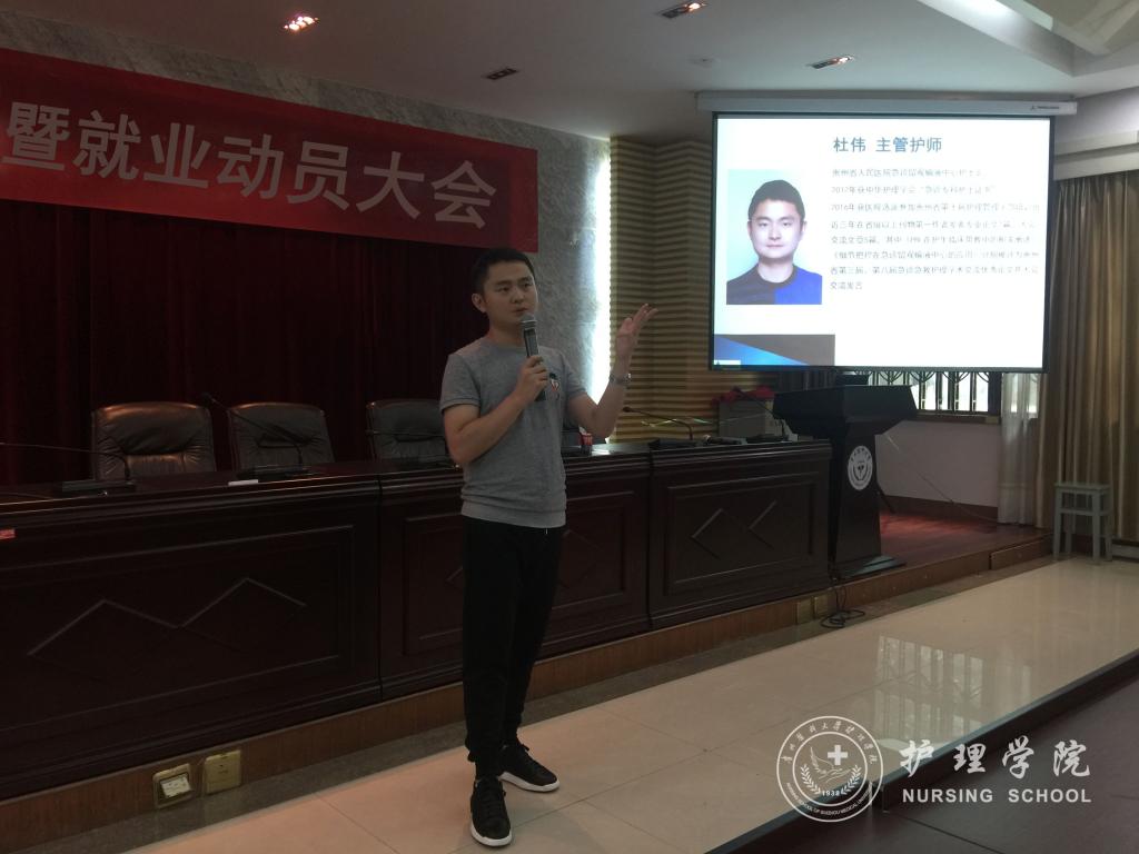 会议首先由我院优秀毕业生代表,荣获2017年贵州省护士岗位技能竞赛PICC护理专业一等奖的钱兰芳、贵州省人民医院急诊留观输液中心护士长杜伟作现身说法。他们用风趣幽默的开场,吸引了同学们的注意力。在和同学们讲述毕业实习经历之余,也分享了她们8年工作、生活中所获得的经验和对护理专业的思考。钱兰芳提醒学妹学弟在实习期间,要进一步明确护理专业内涵、培养良好的职业价值观念;杜伟则强调护理工作积累过程的重要性,鼓励学弟学妹们以身边的优秀护士作为榜样,不断学习和积累,学会成长。