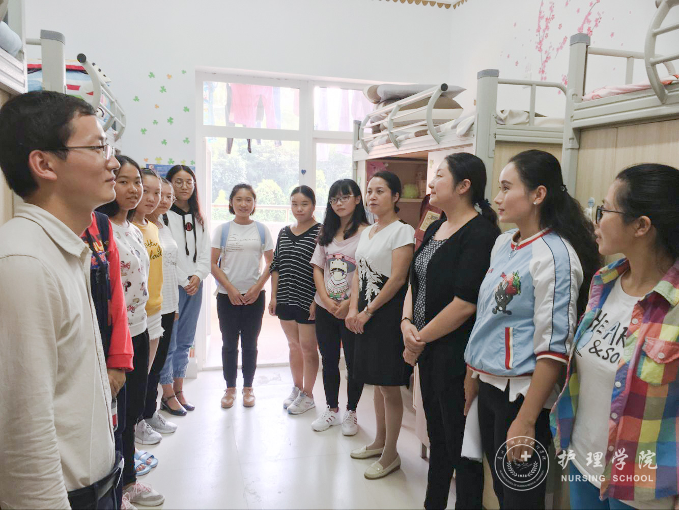 为迎接党的十九大召开、为学校护理学本科专业认证工作营造良好的安全氛围。同时也为了贯彻学校2017年下半年安全稳定工作会议精神,2017年9月12日下午和13日下午,BEAT365英国官网党委副书记杨英、学生科科长曾敏、全体辅导员及学生会干部深入学生宿舍看望学生,了解新学期同学们的学习、生活和思想状况,并对宿舍安全、宿舍卫生、宿舍文化等工作进行检查指导。