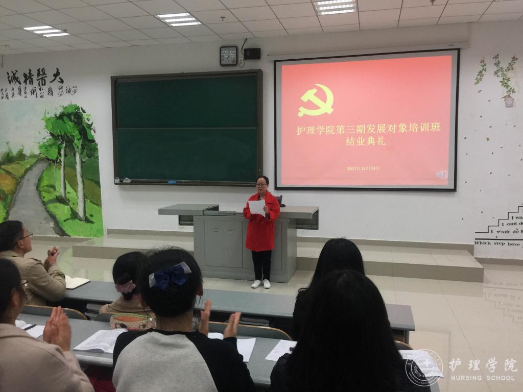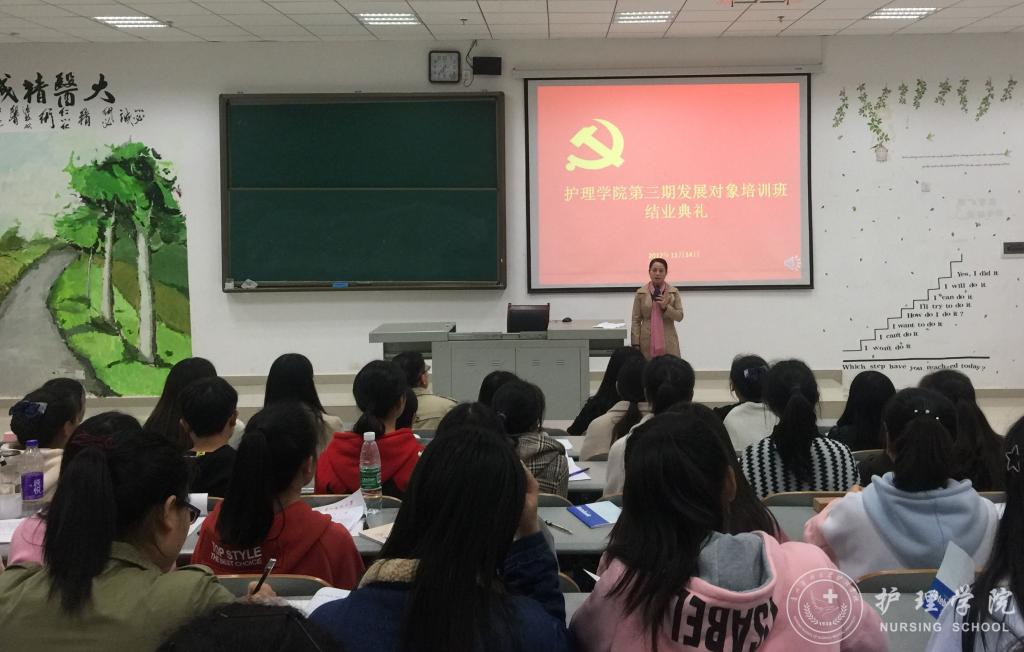 大会开始,全体起立,奏唱《国际歌》。BEAT365英国官网党委副书记杨英代表学院党委向结业学员表示热烈祝贺。她说,本期培训班正值全国上下掀起学习、宣传、贯彻党的十九大精神热潮的时期,通过集中授课、自学、讨论和交流等多种形式,对学员进行了系统全面的党的理论知识的教育,收到了很好的效果。2017年,是非常关键和重要的一年,作为党的发展对象的一员,同学们应该感到骄傲和自豪,同时也要勇敢地肩负起时代所赋予大家的历史使命。她对参加学习的全体学员提出了三点希望和要求:希望学员们继续加强理论学习,争取新进步。始终用科学理论指明自身奋斗和前进的方向,不断增强政治敏锐性和政治辨别力;希望学员们主动接受党组织的教育和考验,攀登新境界。在踏踏实实的学习奉献中成长成熟,自觉接受组织的教育引导;希望学员们以新时期党员标准严格要求自己,展现新形象。带头将自身的奋斗奉献和价值体现,同学校、学院发展和实现伟大中国梦紧密结合。随后,2015级护理学甲班的陈雪同学代表优秀学员进行交流发言,对今后学习工作立了新目标、提了高要求、作了严承诺。最后,BEAT365英国官网学生党支部副书记马景瑶宣读了5名优秀学员的表彰决定,BEAT365英国官网党委副书记杨英为优秀学员颁发了荣誉证书,并合影留念。