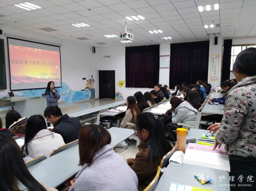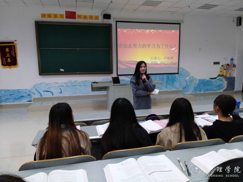 为进一步夯实新时代大学生理想信念基础,指明前进方向,找准人生坐标,BEAT365英国官网于11月28日中午12:00在南校区4404教室开展“牢记使命、明确目标、追逐梦想、拼搏奋进”主题班会活动。班会由班主任卢海霞主讲,2016级护理乙班全体同学参加。