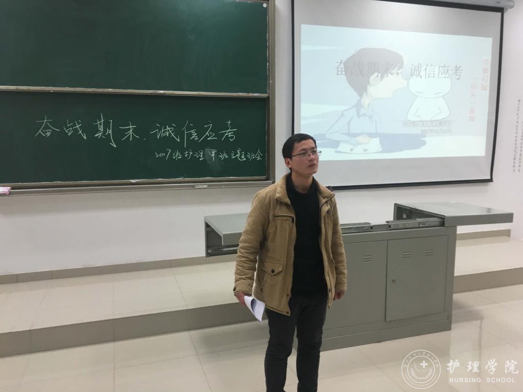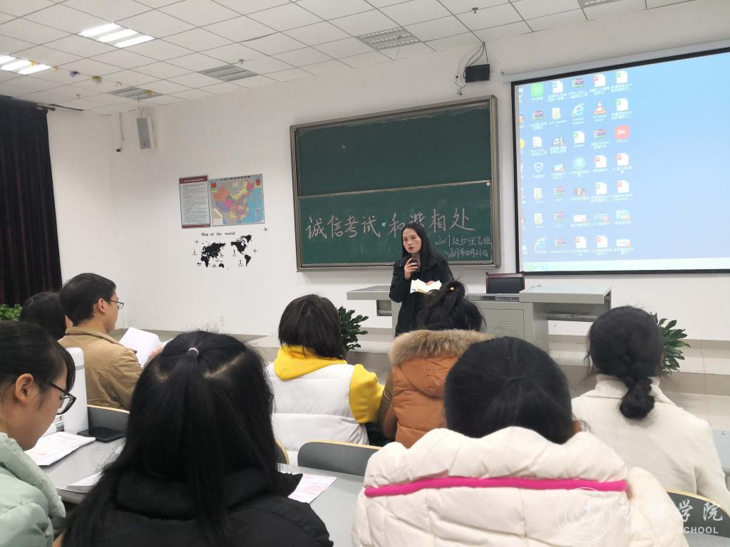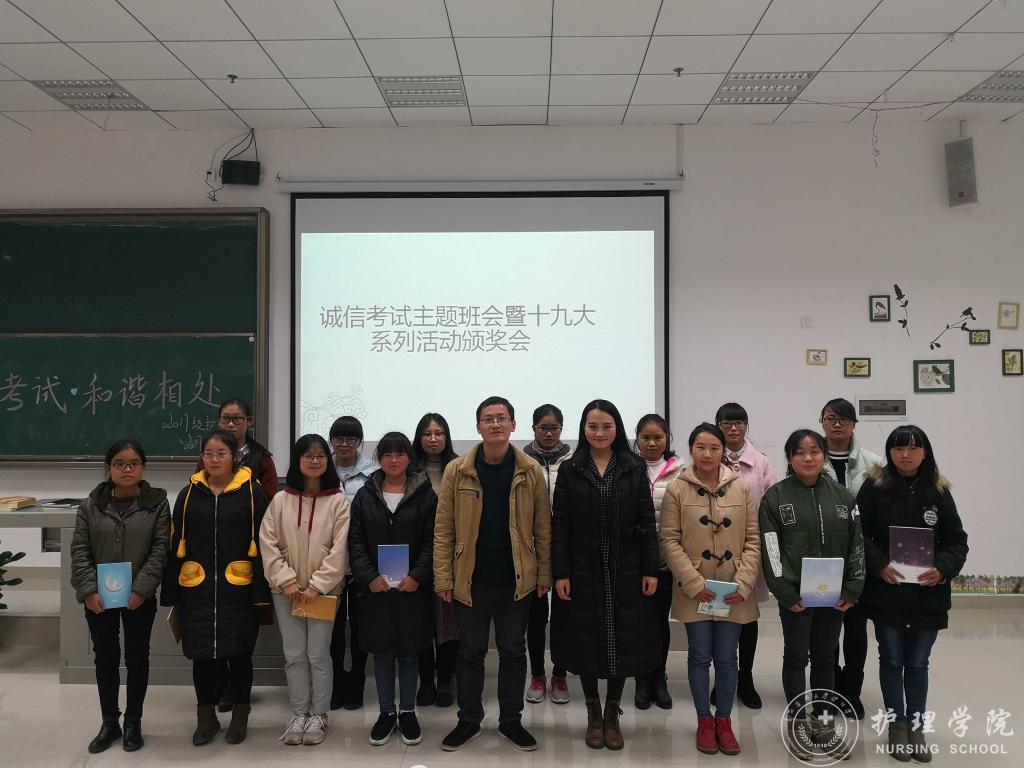 12月21日晚,BEAT365英国官网在南校区7404和7406教室开展诚信考试主题班会暨十九大系列活动颁奖仪式。此次班会由班主任吴俊、王丽,辅导员马景瑶和班级学习委员主讲,2017级护理甲班、乙班全体同学参加,班会由各班班长主持。