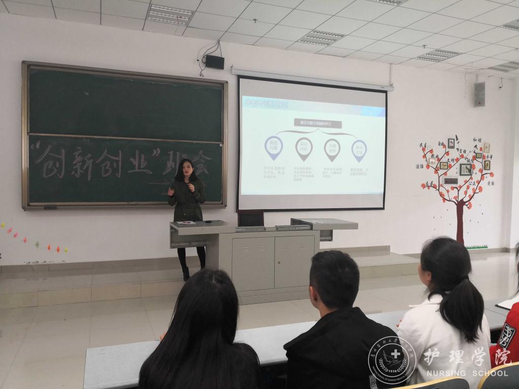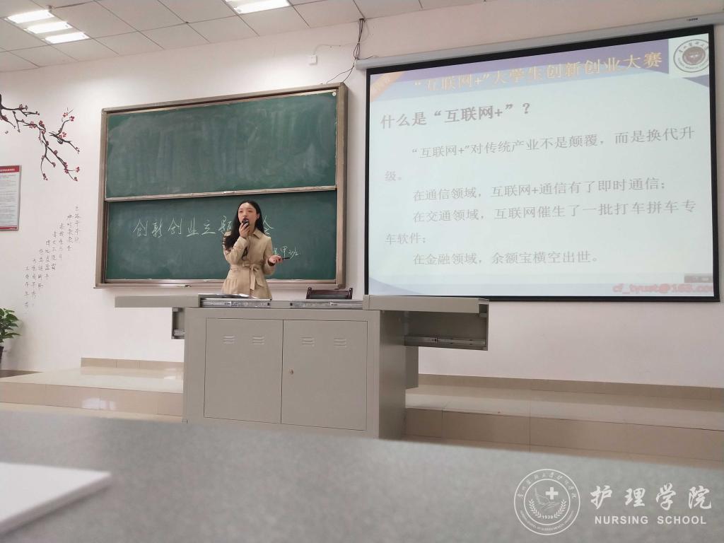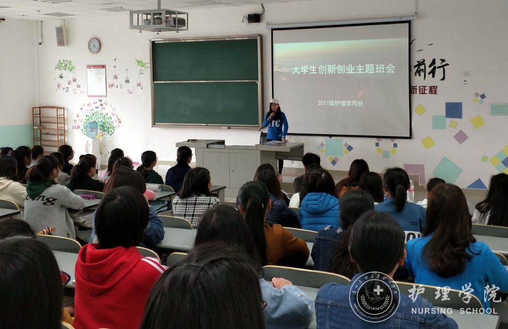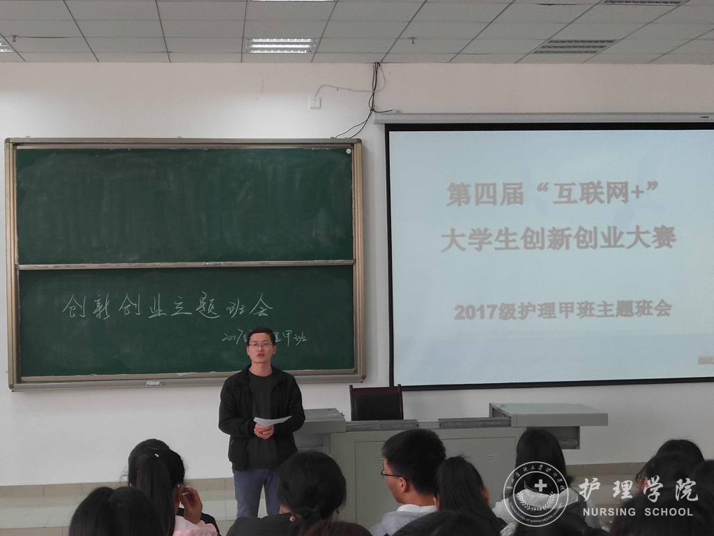 王晓玲、马景瑶分别解读了国家对大学生创新创业的支持政策、学校的大学生创新创业大赛通知、学校对大学生创新创业的激励政策、BEAT365英国官网学生在历年创新创业大赛活动中的获奖情况等,使广大新生对创新创业有了一个基本的了解。王晓玲、马景瑶鼓励同学们在认真完成专业学习的基础上积极参加创新创业活动,在创新创业中增长智慧才干,在艰苦奋斗中锤炼意志品质,在服务社会中成就人生价值。接着,由班主任吴俊、王丽、李宇分别在2017级护理学甲班、乙班、丙班以第四届“互联网+”大学生创新创业大赛为主题进行了专题讲授。班主任老师分别从大赛主题、参赛内容、准备方法等方面具体介绍了大学生创新创业大赛,激发同学们参与的意识。