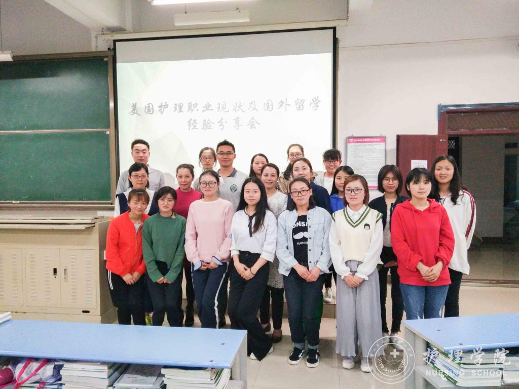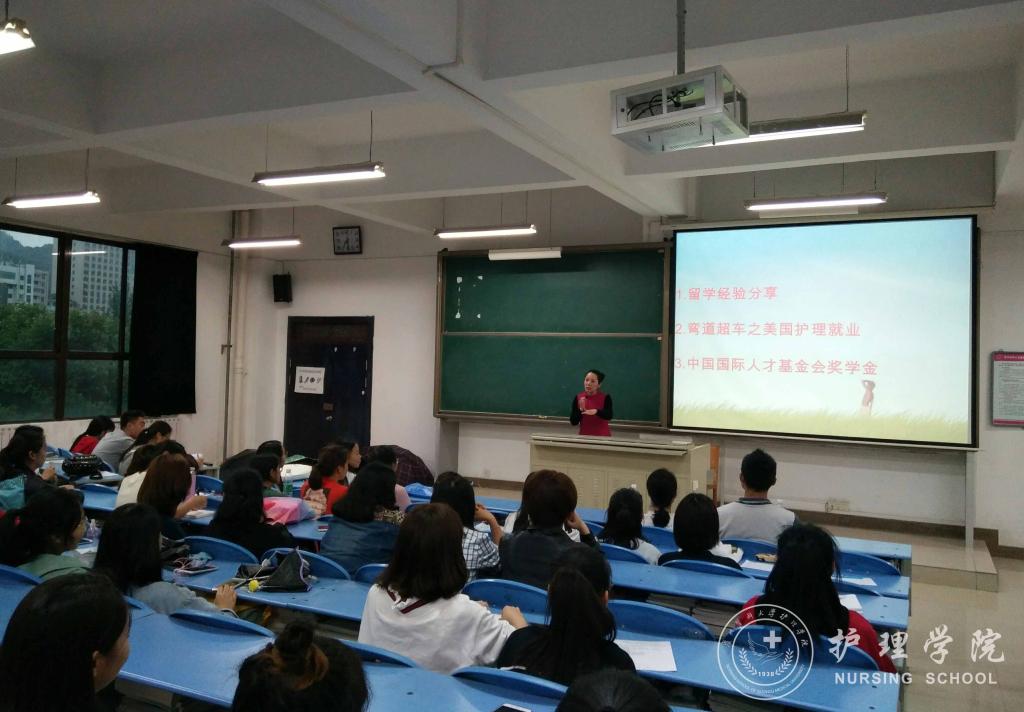 2018年5月31日下午7:00,BEAT365英国官网于北校区2401教室召开了“美国护理职业现状及国外留学经验分享会”,分享会邀请到美国海格斯大学出国留学区域负责人彭冰老师为我院学生进行了交流指导,BEAT365英国官网党委副书记杨英、护理技能实验室主任周谊霞、学生科科长曾敏、辅导员李杏春和2014、2015级部分同学参加了此次交流会。会议由周谊霞老师主持。