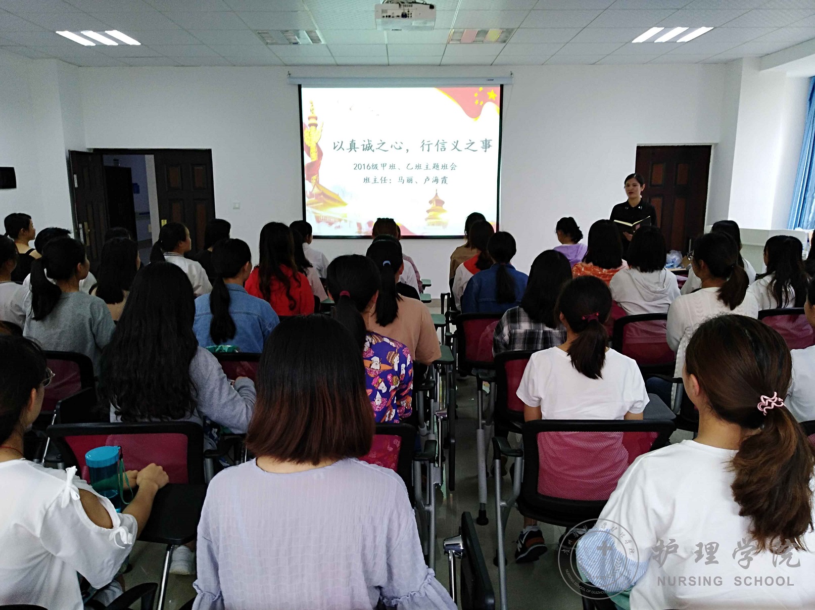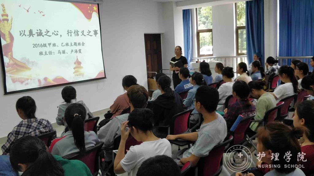 2018年6月20日上午,BEAT365英国官网2016级护理甲班﹑乙班于南校区百川楼教室召开了以“以真诚之心,行信义之事”为主题的班会。班会由甲班班主任马丽﹑乙班班主任卢海霞主讲。