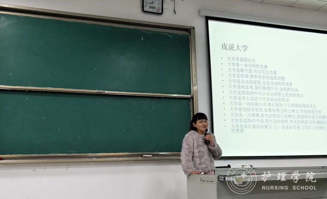 为提高同学们的自我认识,帮助同学们找到奋斗方向,BEAT365英国官网护理2018级甲班于11月25日晚上在南校区1204教室召开“大学生职业生涯规划”主题班会,班会由班主任邹惠美老师主讲,全班同学参加。