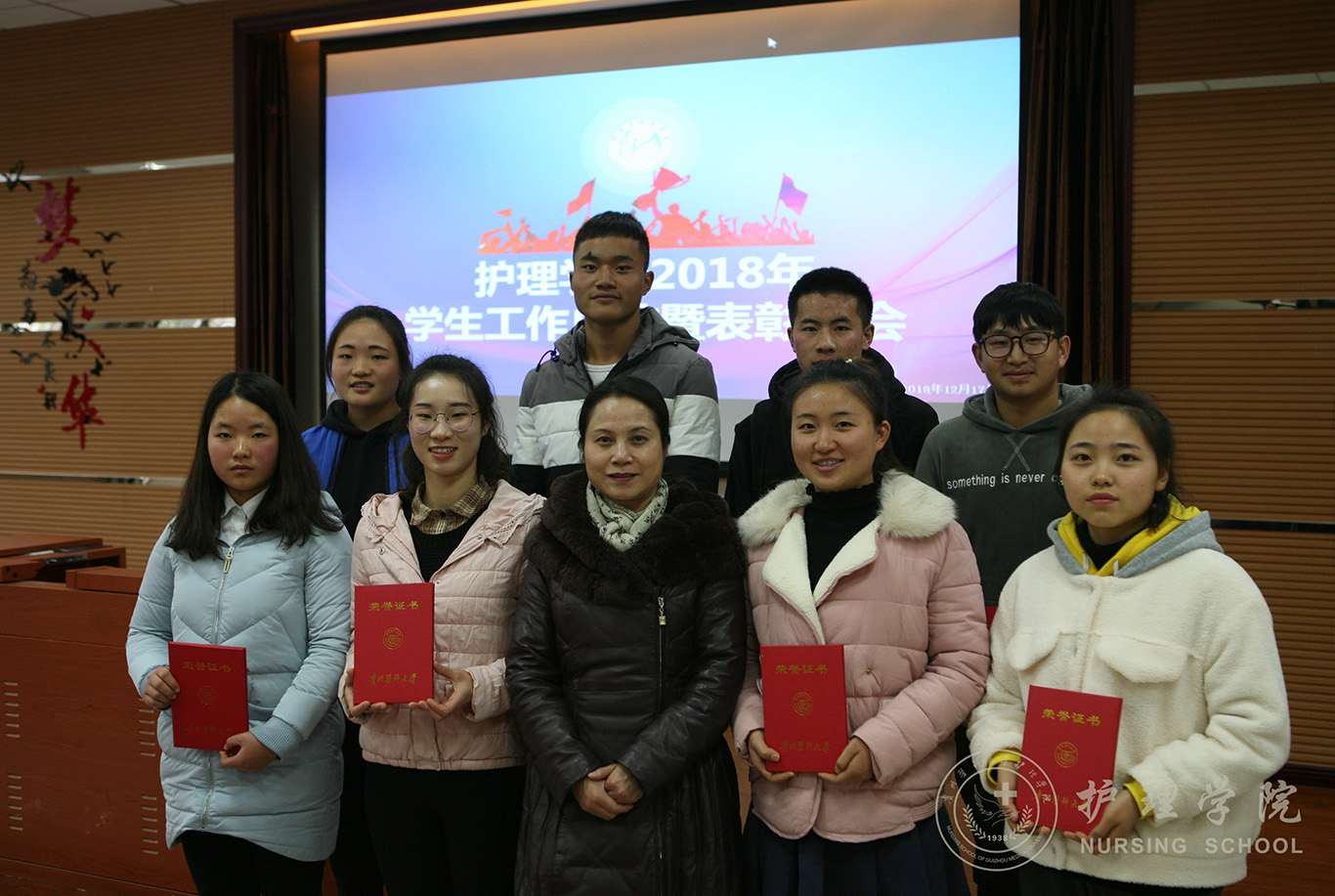 其次,由王秀红宣读2018年学生工作获奖名单,并向获奖者表示祝贺。接着,BEAT365英国官网的领导、老师为获奖的先进集体和个人颁发了荣誉证书,并与获奖者合影留念。
