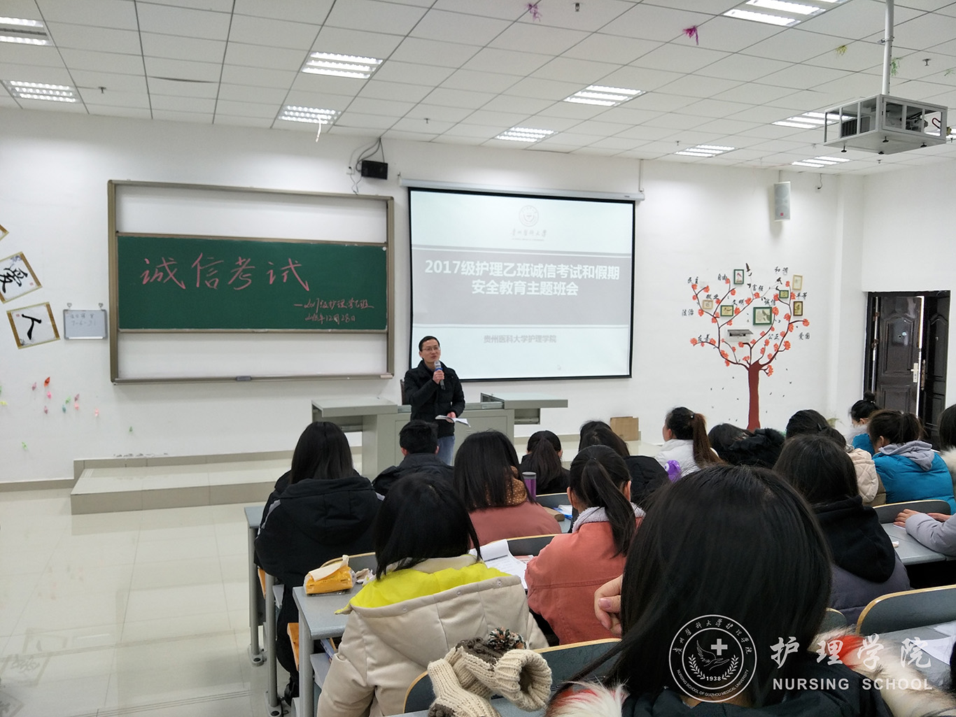 12月28日下午,BEAT365英国官网在南校区7404和7406教室开展诚信考试主题班会。班会由2017级护理甲班、乙班两班班长主持,班主任吴俊、王丽和辅导员马景瑶主讲,全体同学参加。