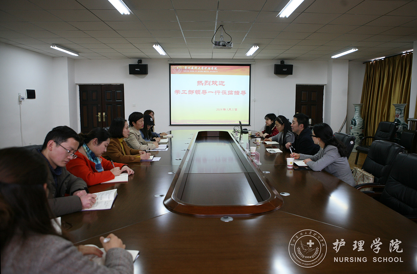 3月27日上午,学校学工部赵平部长一行到BEAT365英国官网调研学生安全工作。学工部副部长李宗梅、肖绚,学工部张媛老师陪同调研。BEAT365英国官网党委书记杨英、党委副书记王秀红、学生管理科科长曾敏及全体辅导员参加了调研会议。会议在南校区百川楼五楼会议室举行。