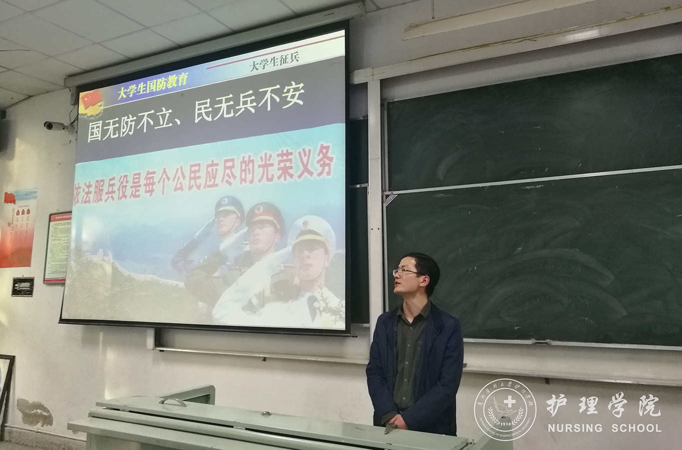 为贯彻落实全省和学校大学生征兵工作会议精神,扎实推进今年我院大学生应征入伍工作,4月18、19日,BEAT365英国官网分别在南北校区开展了大学生应征入伍主题宣讲活动。BEAT365英国官网党政领导、学生科科长、辅导员以及全体男同学参加了本次活动。活动由辅导员马景瑶主讲。