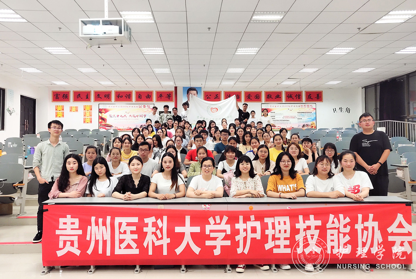 本次会议分为三个阶段进行。首先,王秀红致开幕词。她肯定了协会在同学们护理专业技能学习中发挥的引领作用及协会成立以来取得的成绩,强调协会的发展面临着许多机遇,尤其是我院在接过“贵州红十字志愿护理服务队”队旗后,协会以后的发展平台将更加广阔。同时,她也对协会的成员们提出了三点要求:第一,加强政治理论学习,践行习近平总书记系列重要讲话精神,做勇于担当,敢于担当的好青年,为实现中国梦而不懈奋斗;第二,注重提升自我的同时要增强协会凝聚力和影响力,鼓励会员们努力练习护理技能操作,发挥模范作用;第三,协调好活动参与同学习之间的关系,合理安排作息时间,促进德智体美劳全面发展。接下来,会议对本学年表现突出的干部和优秀会员进行了表彰,王秀红和毕丽为他们颁发了荣誉证书并合影。最后,在协会现任会长王瑞宣布竞选流程和竞选规则后,紧张而激烈的换届选举正式开始。同学们纷纷上台进行竞选演讲,个个表现得落落大方,自信满满,充分展示了护理学子积极向上的精神风貌。所有参会人员根据竞选者的表现进行了现场投票。