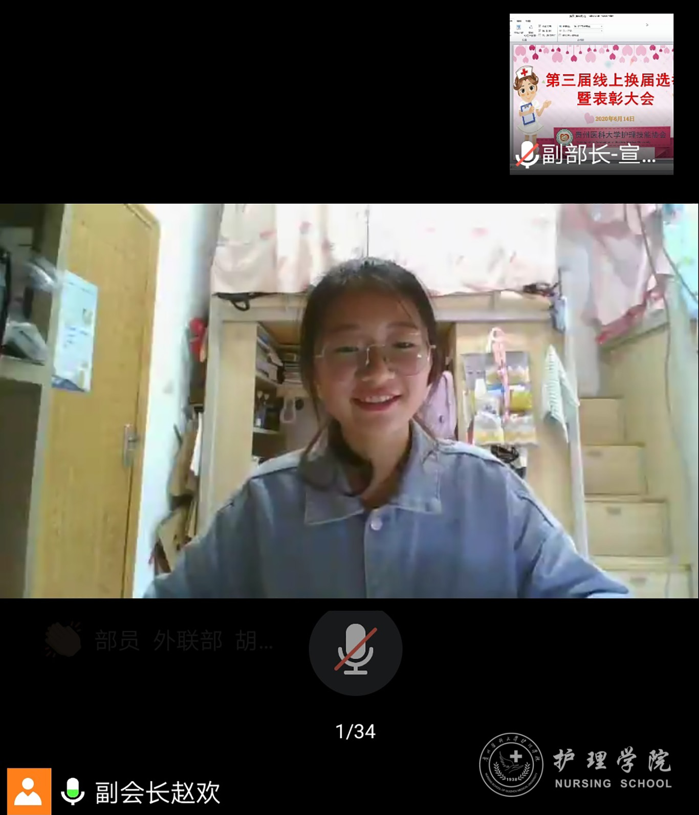 会议共分为三项内容。第一项为表彰大会,由王晓玲老师宣读获得优秀干部以及优秀成员的名单,优秀干部代表秘书部副部长杨庆庆同学和优秀部员代表策划部刘筱璇同学作为代表发言,表述了各自在协会活动中的收获,感谢老师和同学们的帮助,让自己在各方面都得到了很好的提升。会议第二项为换届选举,本着公平、公正、公开的原则,选取方式为问卷星进行线上投票。竞选会长、副会长、各部门部长、副部长的同学依次进行了演讲,每位同学都进行了精彩激烈的演讲的同时也充分展示了自己的优势。竞选演讲结束之后,协会会长申思蓉同学进行了协会工作总结发言,寄托新成员们新的希望,祝福协会能在新一届协会干事们的带领下越办越好。最后,王晓玲老师对本次大会进行了总结,她讲到学联学生会改革的必要性,并对学生会礼仪部的加入表示欢迎,同时对协会的工作作出了肯定,对新一届协会干事们提出了要求,鼓励同学们团结进取,学好扎实基本功,做好各方面的领头羊,不断提升护理专业学生的自我认同,铭记南丁格尔誓言,为人类健康和生命而不懈奋斗,希望协会一路乘风破浪,愈来愈好。