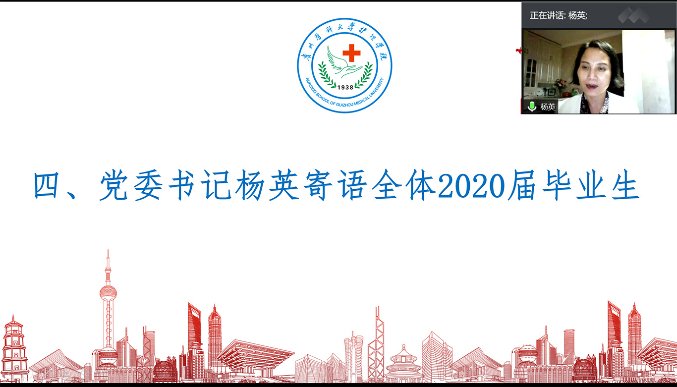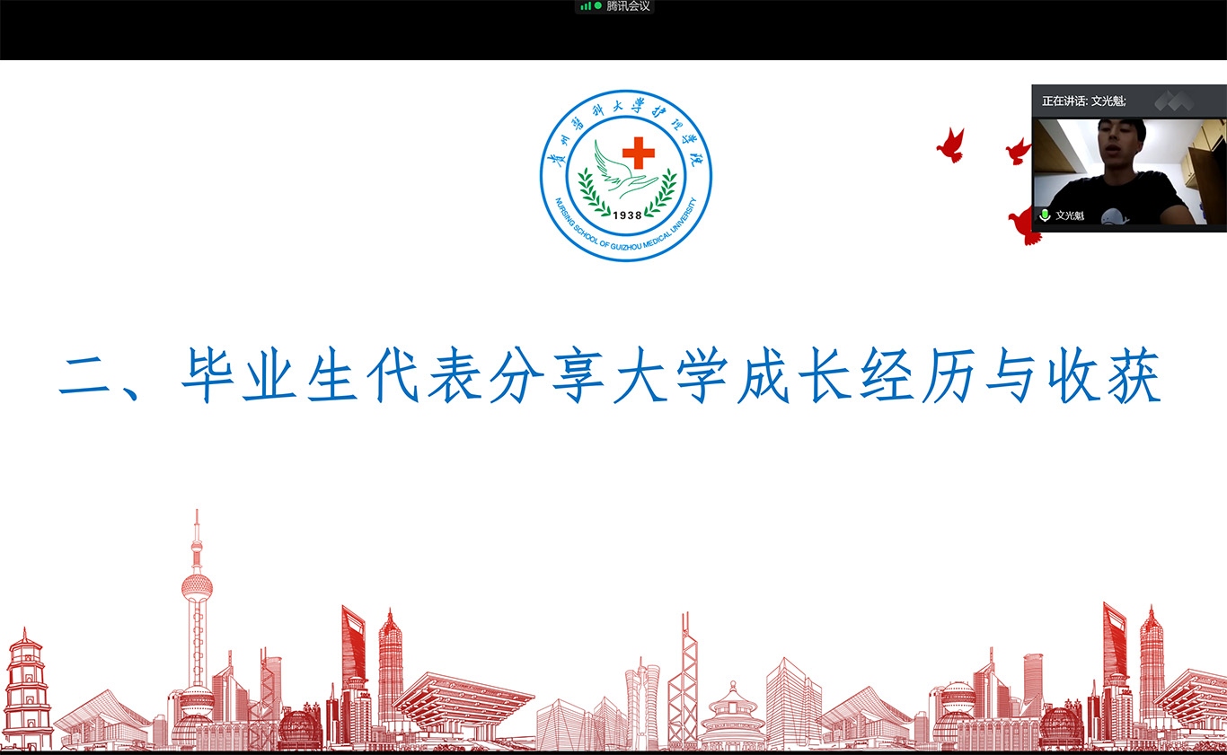 接下来,2020届毕业生文光魁、王伟月、王容三位同学作为毕业生代表分享了大学四年在贵医的成长经历与收获。跟着三位同学的分享,大家共同回忆进入贵医后的点点滴滴,回味了大学生活中的喜怒哀乐,追忆青春、畅想未来。三位同学代表全体2020届毕业生感谢BEAT365英国官网全体老师、感恩贵医,同学们决心将大学的美好记忆带到工作岗位,不忘初心,砥砺前行。