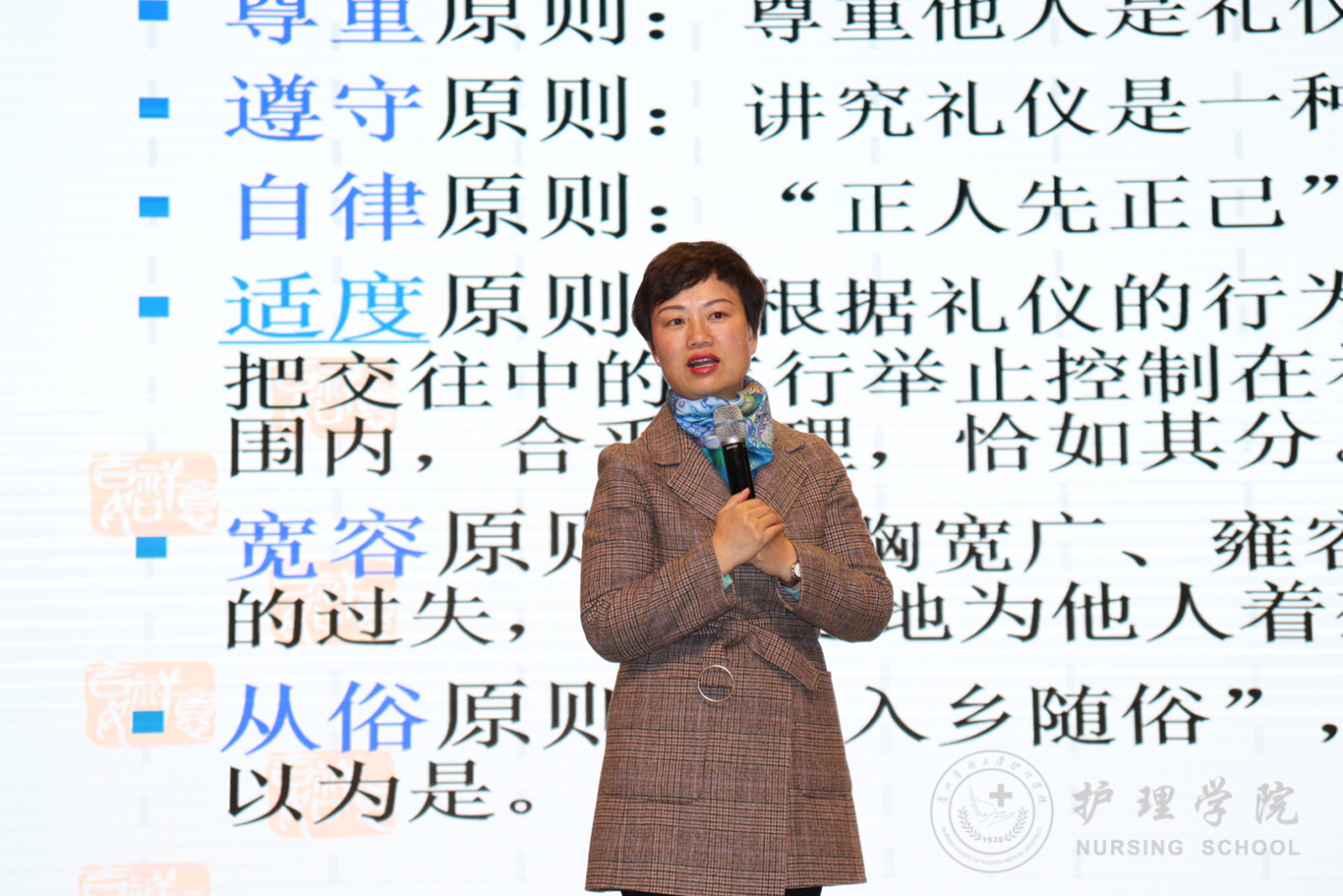 讲座中,王秀红以“什么是礼仪?”引入此次培训讲座的主题,深入浅出、生动形象地讲述了礼仪的定义、概念、重要性,让大家知道礼仪是一种处事理念和行为规范,礼仪是一种风骨,流淌在我们的血液当中。接下来她阐述了礼仪的六个基本原则,也谈及了许多着装的基本原则,并联系实际生活和社会普遍现象为大家生动细致讲解了当代大学生应当具备的礼仪,如化妆礼仪、着装技巧、餐桌礼仪及宿舍礼仪等,其中还特别强调了面试礼仪、师生之间的礼仪规范。最后,她用“美要实践,美在实践”作为结束语,结束了本次讲座。