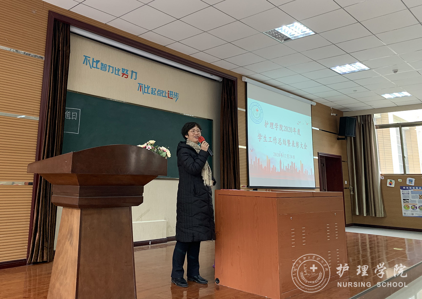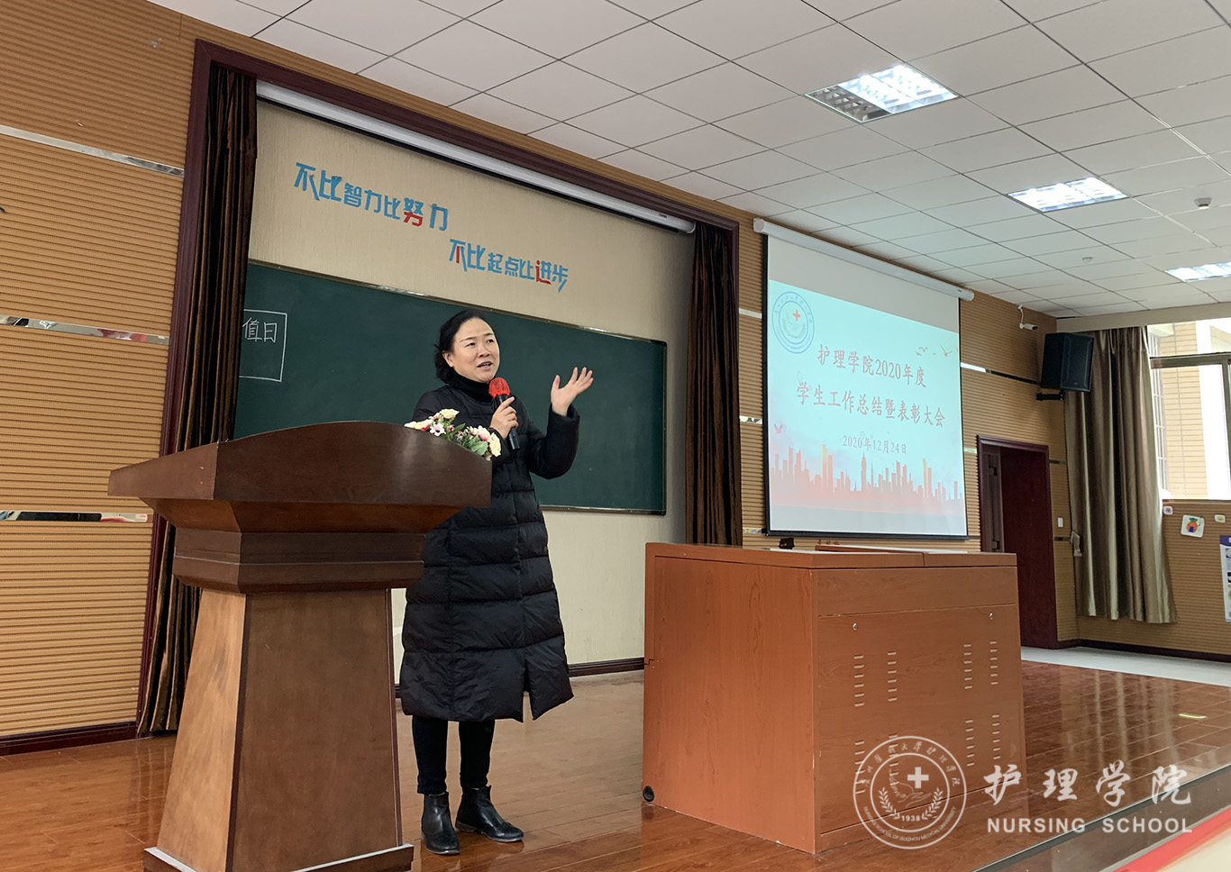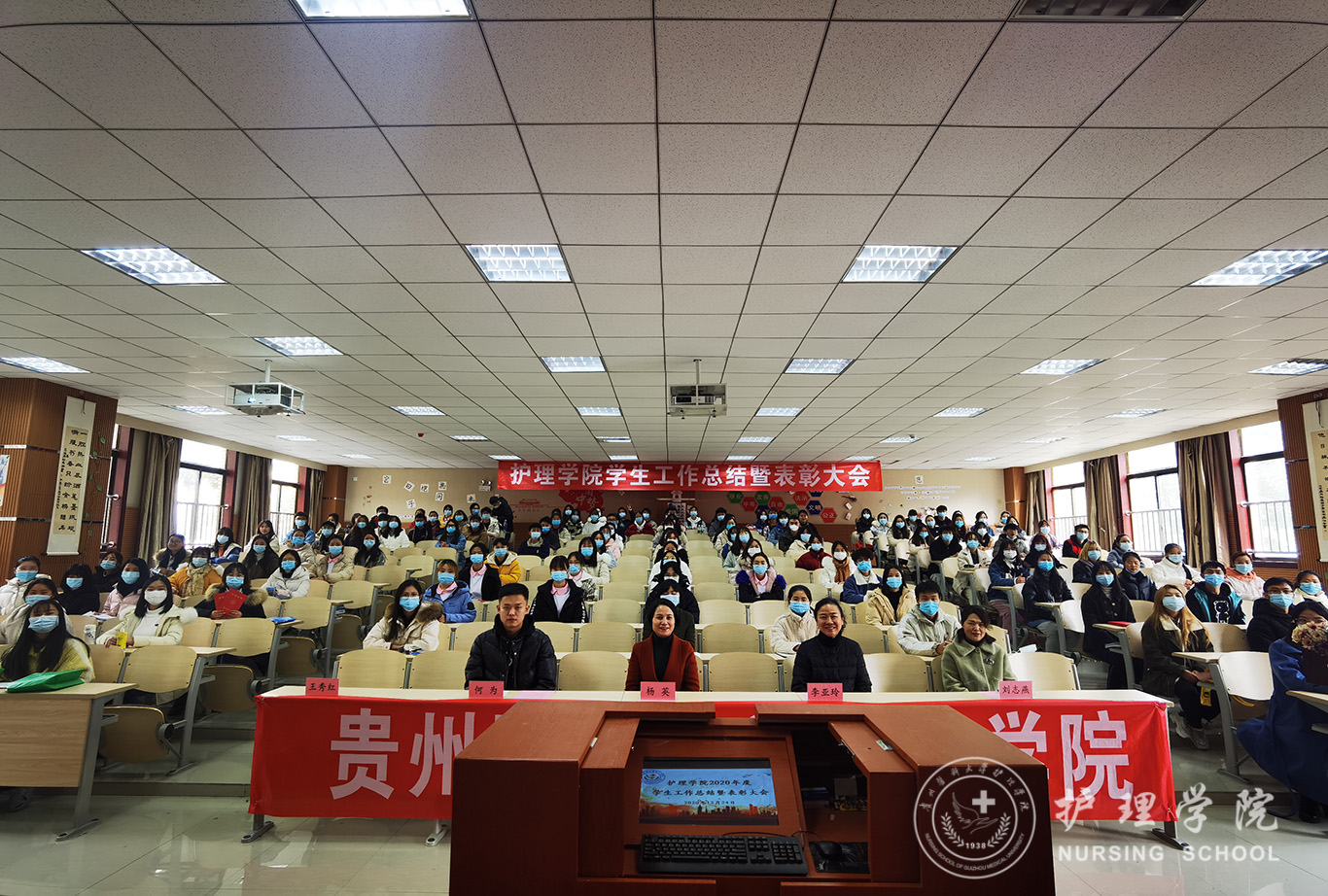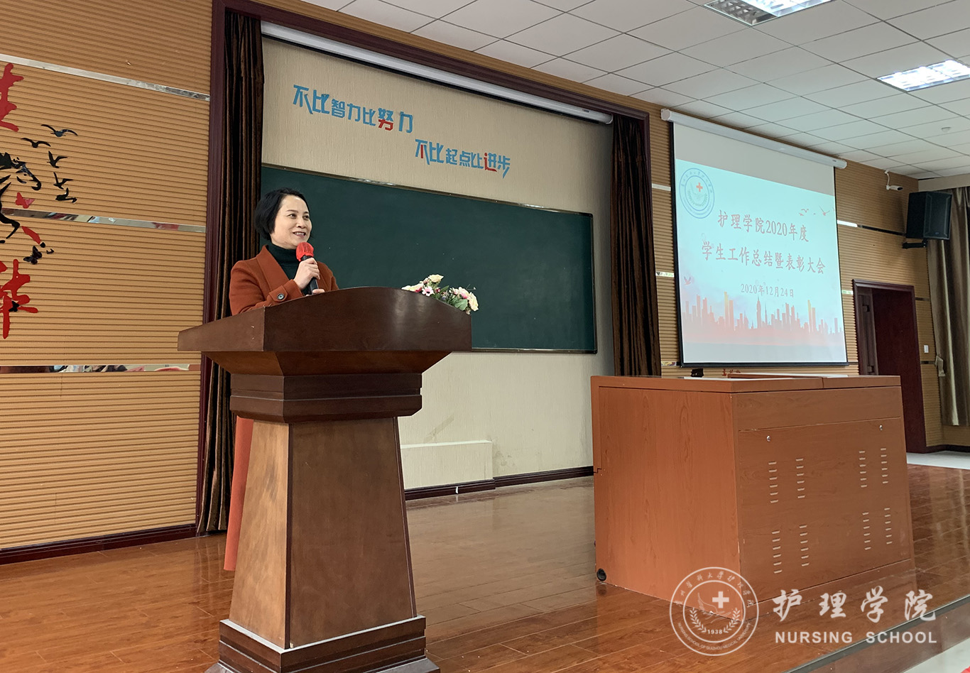 会议第一项议程:BEAT365英国官网党委副书记何为作BEAT365英国官网2020年度学生工作总结报告,何为从党团建设、学生日常管理以及获奖情况等方面对我院2020年度的学生工作进行了总结。第二项议程:BEAT365英国官网党委委员、副院长刘志燕宣读了2020年度学生工作获奖名单。第三项议程:护理学2019级甲班团支书张凤毅作为获奖优秀学生代表作交流发言。第四项议程:BEAT365英国官网党委委员、副院长王秀红讲话,她肯定了大家过去一年取得的成绩,鼓励大家继续努力再创辉煌。第五项议程:BEAT365英国官网党委委员、院长李亚玲讲话,她向这一年来为学院学生工作付出辛勤劳动的老师和学生干部表示感谢,同时希望同学们学好专业课,通过自身的求学和工作经历引导大家对护理行业确立比较清晰的认识。第六项议程:BEAT365英国官网党委书记杨英总结讲话,她对2020年度学生工作给予了肯定,给同学们提出了三点希望:第一、希望同学们牢记学生的身份,努力学习不松懈;第二、希望全体学生干部重视团队精神的培养,热爱专业、热爱班级、热爱学院。第三、希望同学们开拓创新、与时俱进,培养创新精神。大会最后一项议程:参与的领导为获得奖励的优秀个人和先进集体颁奖并合影留念。
