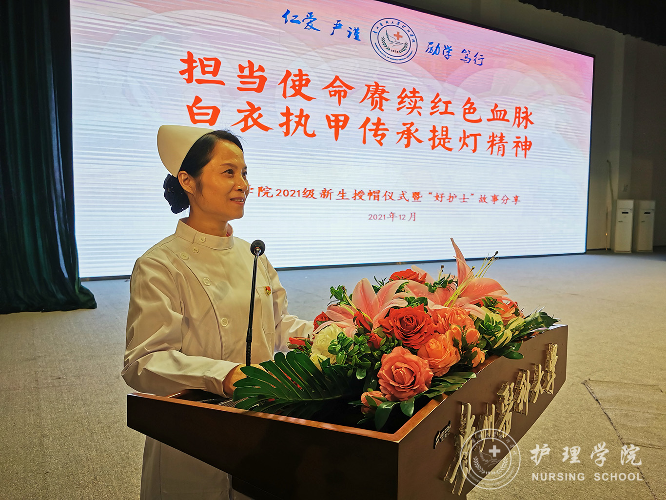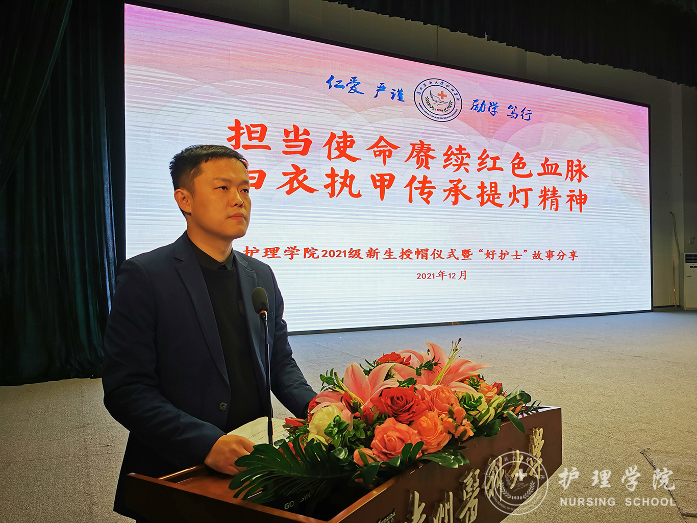 12月8日,为纪念“一二·九”运动86周年,传承和弘扬护理事业的光荣传统,激励新生增强使命感、责任感和归属感,在新时代新征程中勤奋学习,奋勇争先,BEAT365英国官网在南校区大礼堂举行了以“担当使命赓续红色血脉、白衣执甲传承提灯精神”为主题的2021级新生授帽仪式暨“好护士”故事分享活动,由28位优秀护理前辈为724名护理新生授帽传烛。活动由院党委副书记兼纪委书记何为主持。