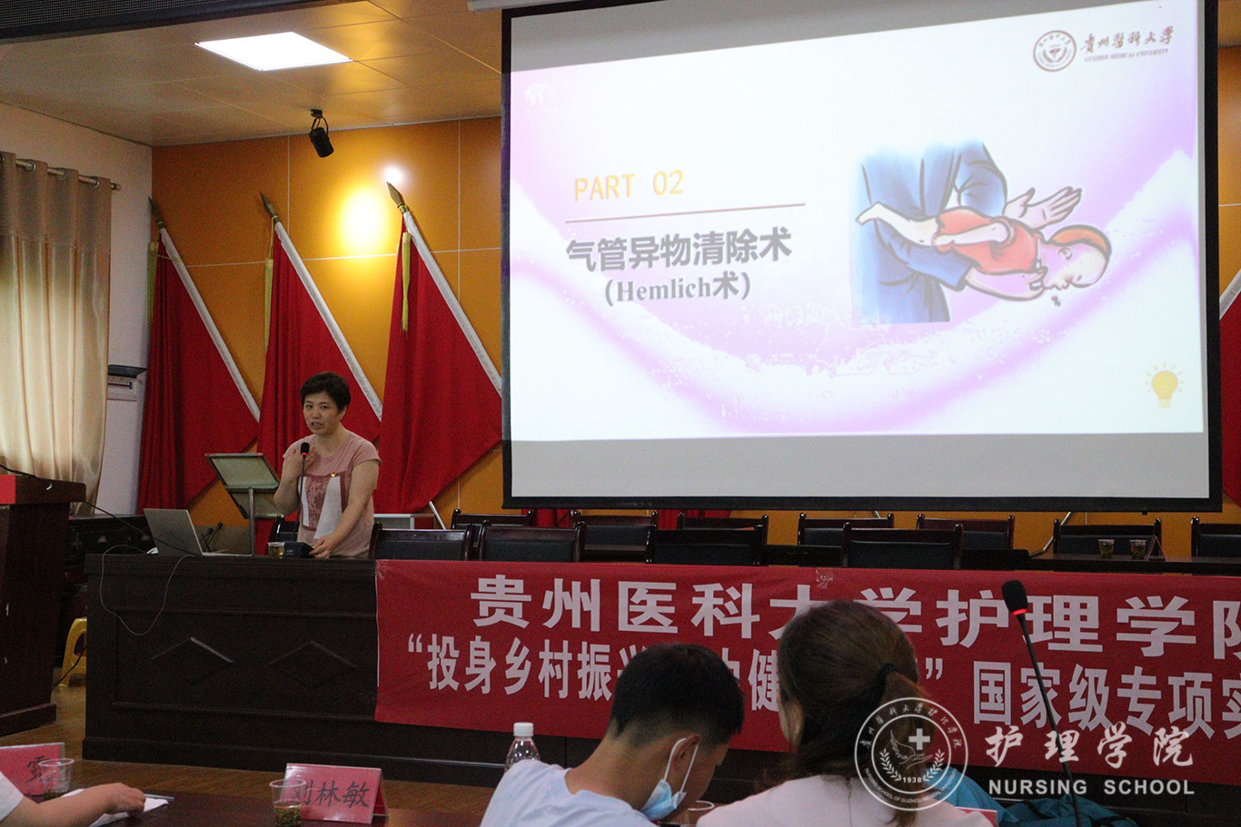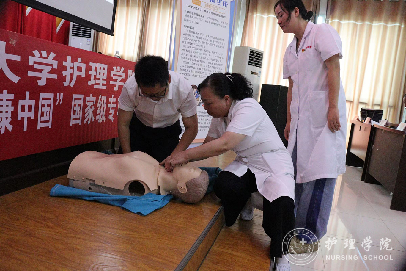 仪式结束后,BEAT365英国官网教师党员代表张仁莉、晏家芳、刘林敏、肖霓及BEAT365英国官网2022年暑期三下乡社会实践服务队的同学向蕉溪镇人民政府全体职工及各村负责健康建设工作的干部开展了健康知识讲座,对海姆立克急救法、心肺复苏术等急救技术进行了宣讲。