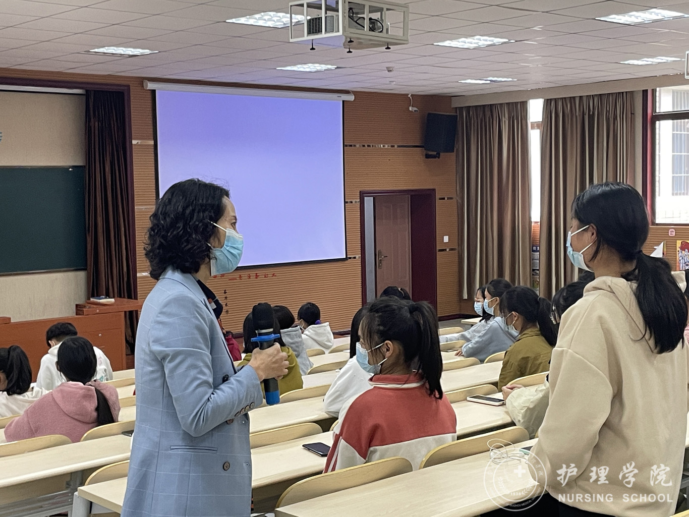 课前,杨英在班级与同学们亲切交流,关心同学们近期学习生活情况。随后,她与同学们一同听课,一同感受线下课堂浓浓的学习氛围,评估课程教学质量。