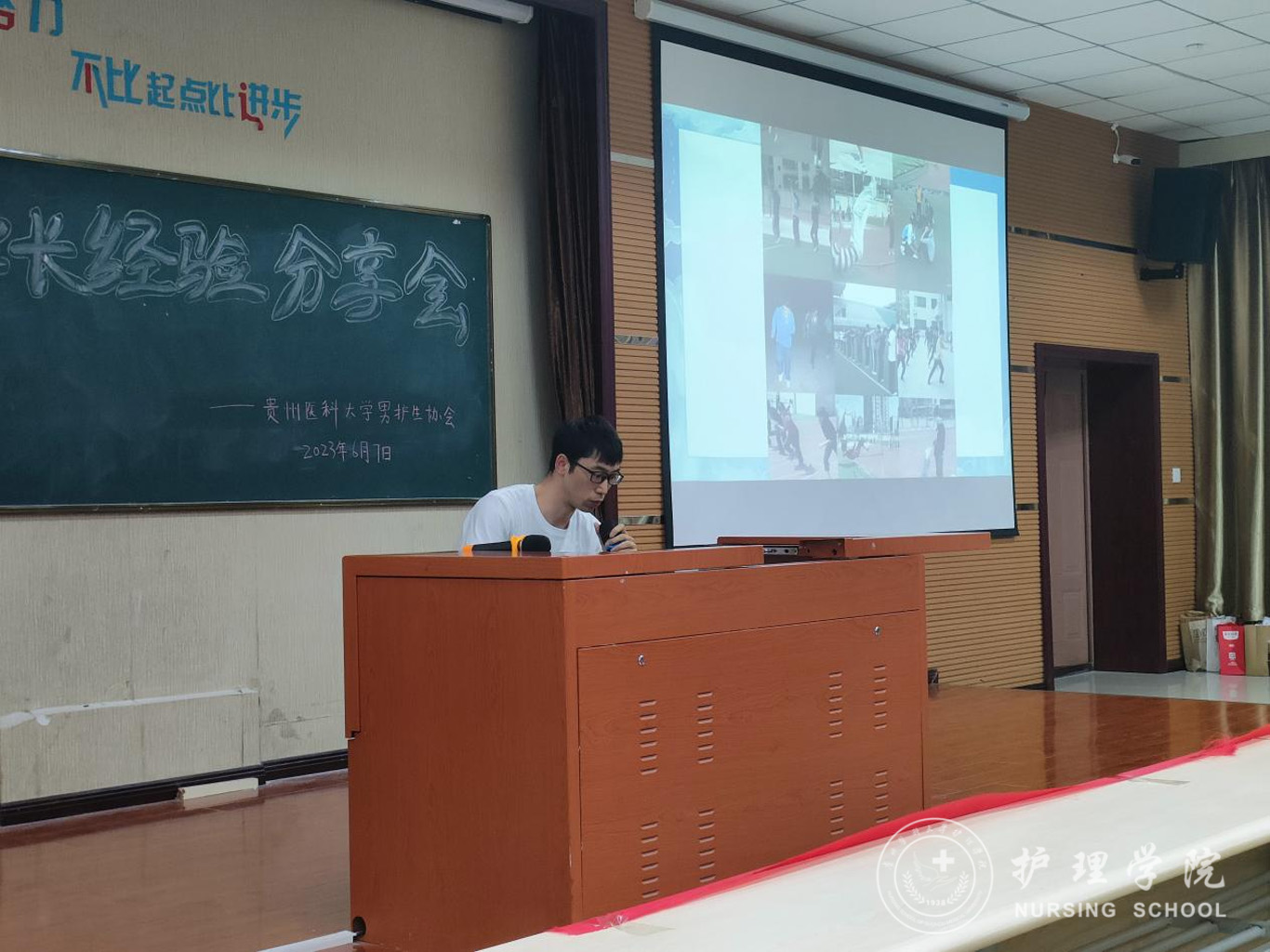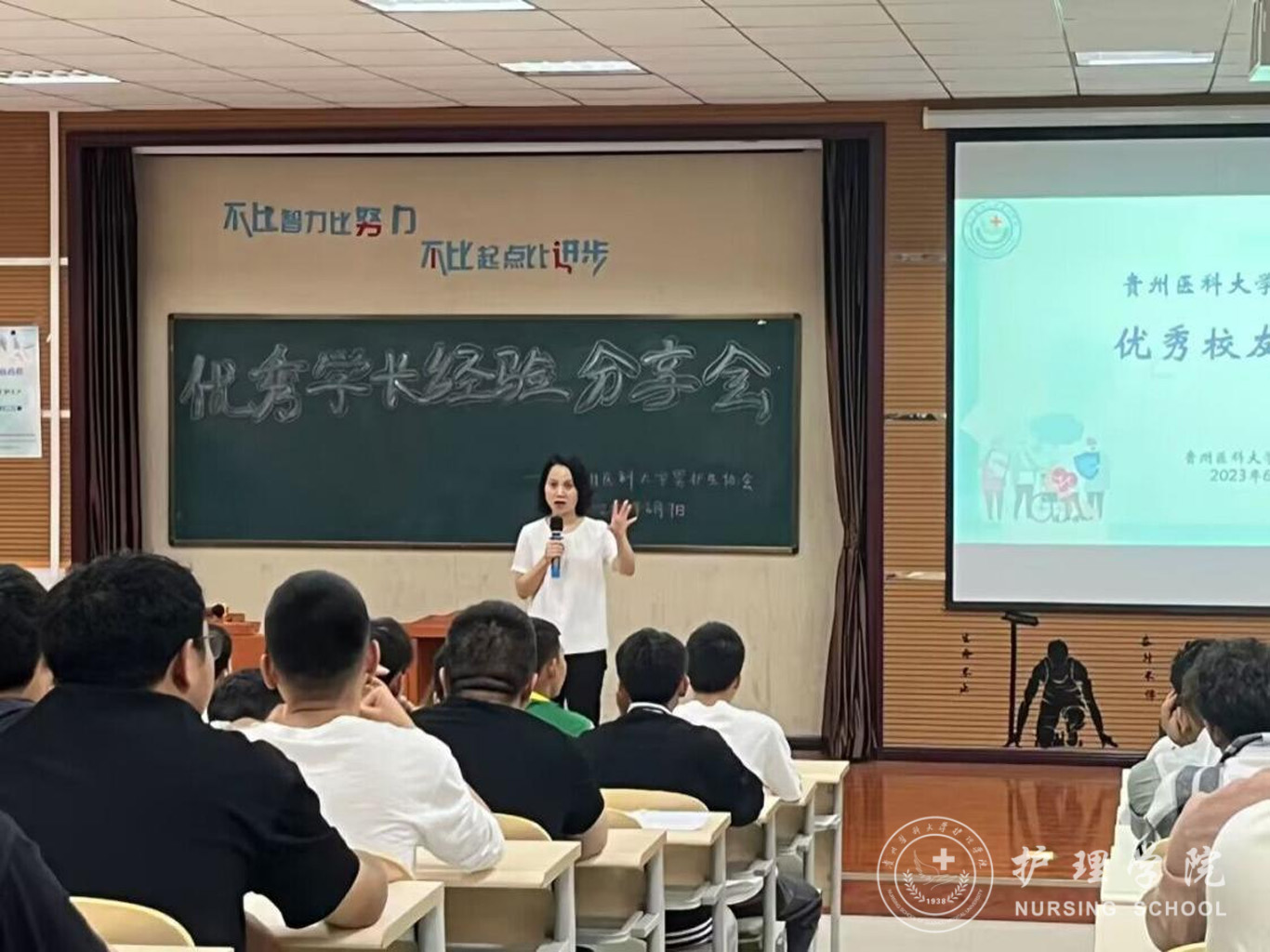 首先,曾荣获“援鄂抗疫英雄”称号、得到贵州省人民政府记功的谭洪林向在场的同学分享了自己当时参加援鄂抗疫的情景。在新型冠状病毒肺炎疫情爆发后,他主动请缨,奔赴抗疫一线,和贵州省援鄂医疗队的成员一道打赢了疫情防控阻击战。谭洪林勉励同学们要学习过硬本领,勇于担当、善于作为,在祖国和人民需要的时候主动奋斗在护理第一线,为保卫人民群众的生命健康安全奉献自己的力量。接着,曾获推免研究生资格于武汉大学攻读硕士研究生毕业的王进波回顾了在校期间学习时学院的培养,他谈到在校期间学院曾开展了各种形式的专业思想教育和专业技能培训,这些专业思想教育和专业技能培训融入了他的生命,使他不断成长为一名保持感恩、热爱、奉献、坚守的“白衣天使”,他希望在校同学们把握时光,珍惜机会,不断加强自身专业本领学习,始终学在实处、做在前列,绽放属于护理学子的专业光辉。最后,杨英作讲话并提出希望,她勉励同学们学会改变、学会自励、发奋学习,在担当中历练,在尽责中成长,练就攻坚克难的本领,磨炼百折不挠的意志,脚踏实地、砥砺前行,在人生的道路上行稳致远,焕发属于自己青春的绚丽色彩。