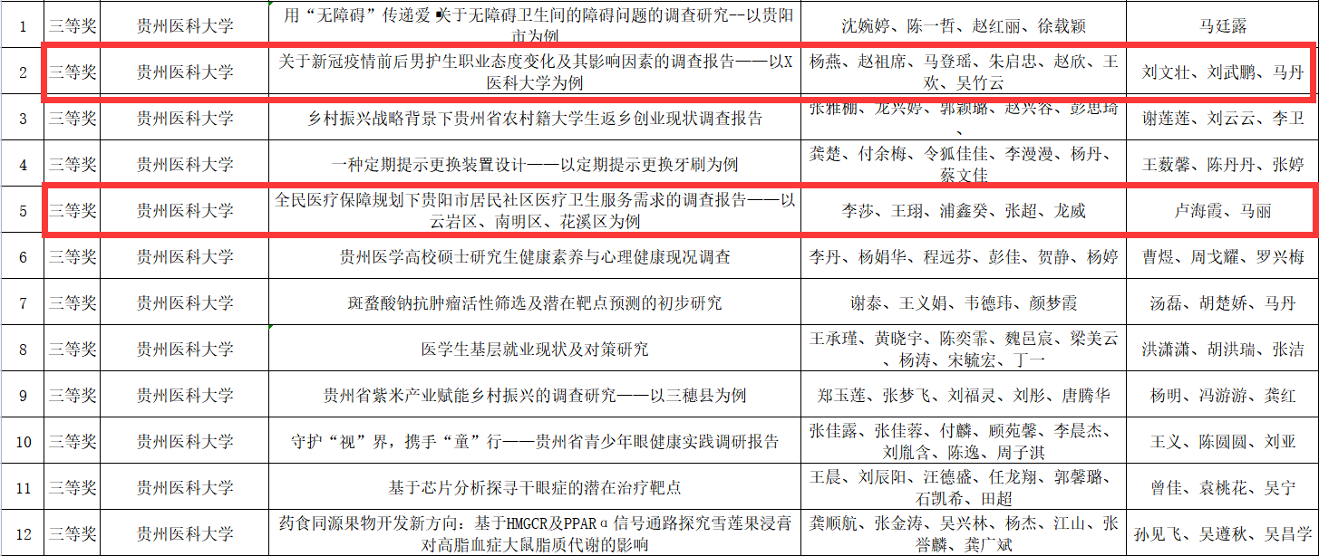 在第十八届“挑战杯”全国大学生课外学术科技竞赛中,我院推出32支队伍参加了校赛,经过层层选拔,在贵州省终审决赛中,由刘文壮、刘武鹏、马丹指导的《关于疫情前后男护生职业态度变化及其影响因素的调查报告——以X医科大学为例》荣获省级三等奖,成员:杨燕、赵祖席、马登瑶、朱启忠、赵欣、王欢、吴竹云;由卢海霞、马丽指导的《全民医疗保障规划下贵阳市居民社区医疗卫生服务需求的调查报告——以云岩区、南明区、花溪区为例》荣获省级三等奖,成员:李莎、王珝、浦鑫癸、张超、龙威。