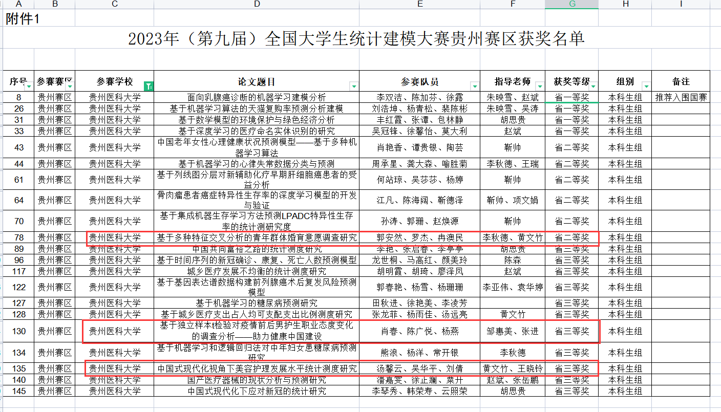 在2023年(第九届)全国大学生统计建模大赛中,我院推出8支队伍参加校赛,经过层层选拔,在刚刚结束的省赛中,由李秋德、黄文竹指导的《基于多种特征交叉分析的青年群体婚育意愿调查研究》荣获省级二等奖,成员:郭安然、罗杰、冉澳民。由邹惠美、张进指导的《基于独立样本t检验对疫情前后男护生职业态度变化的调查分析——助力健康中国建设》项目荣获省级三等奖,成员:肖春、陈广悦、杨燕。由黄文竹、王晓玲指导的《中国式现代化视角下美容护理发展水平统计测度研究》荣获省级三等奖,成员:汤馨云、吴华平、刘倩。