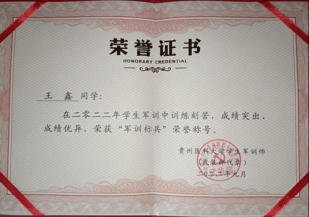 在2022年9月在军训中刻苦努力,荣获“军训标兵”的称号: