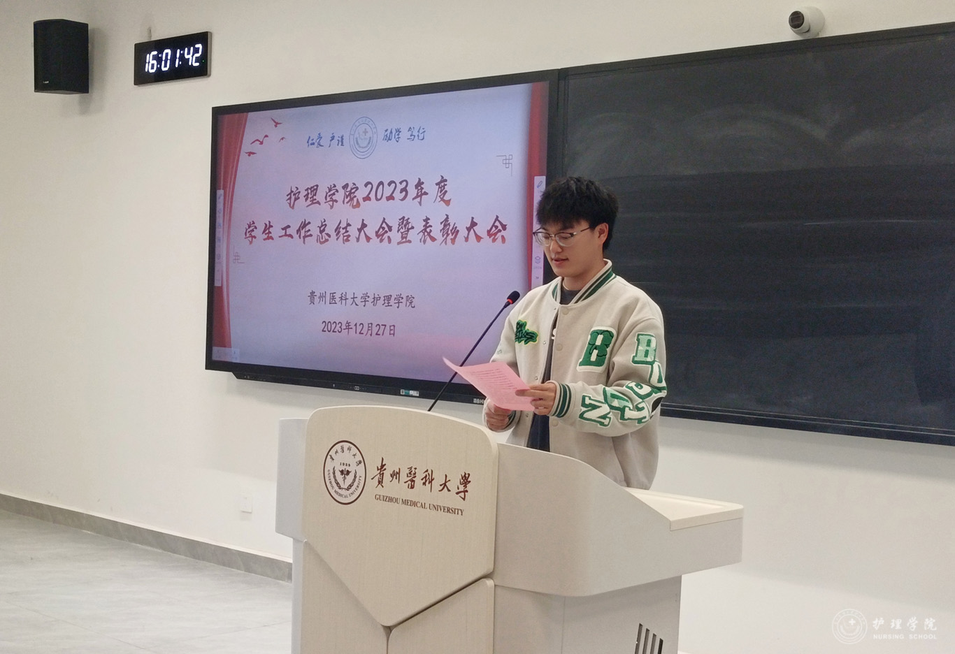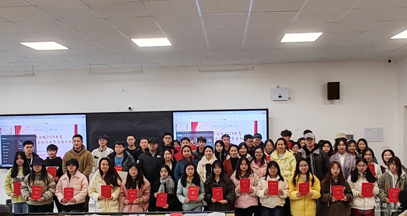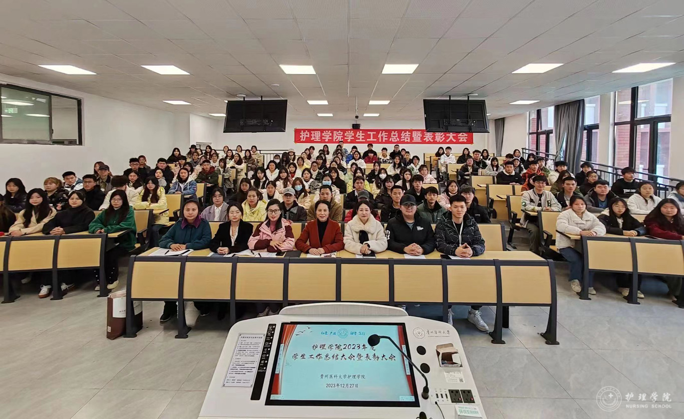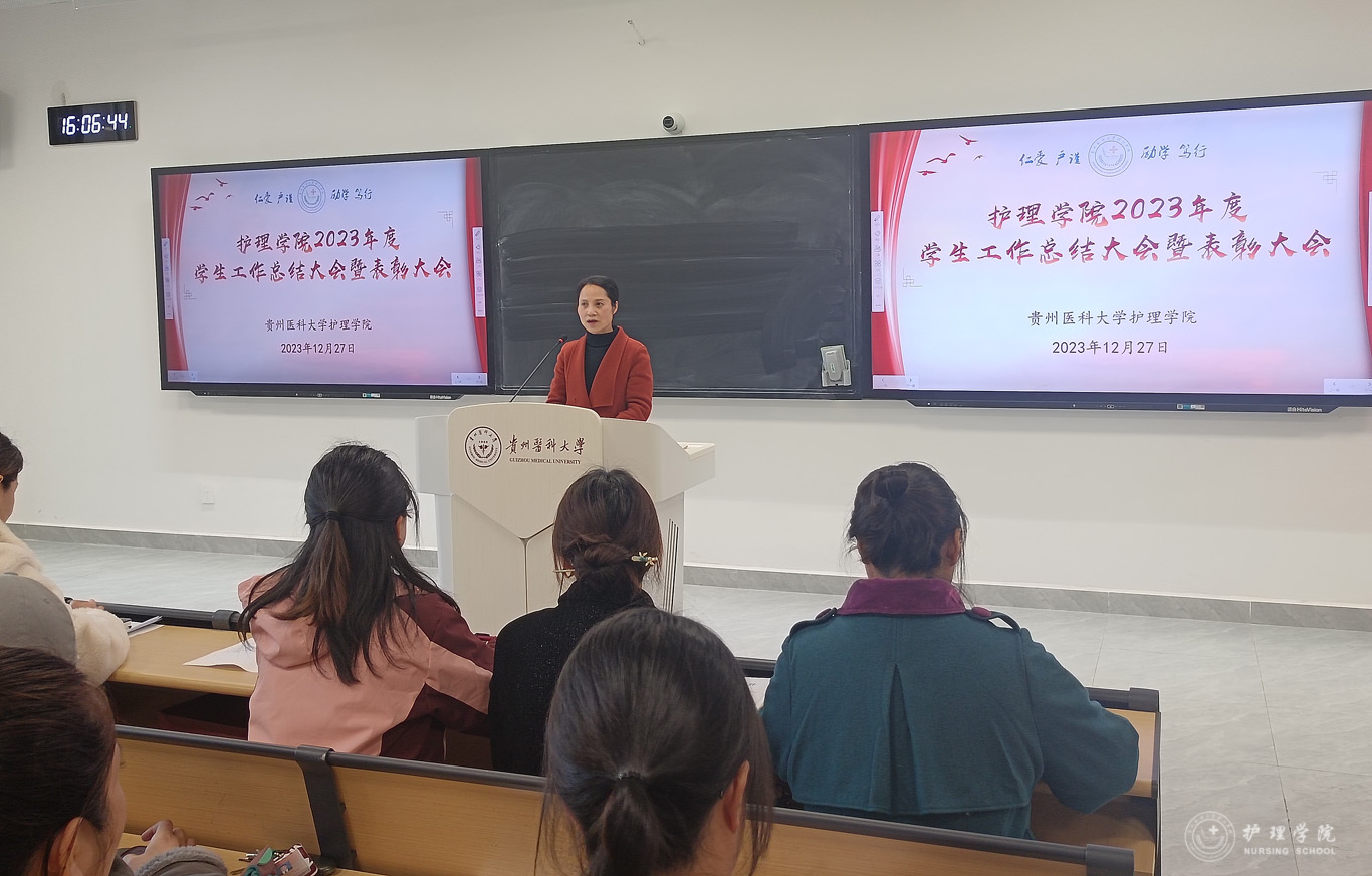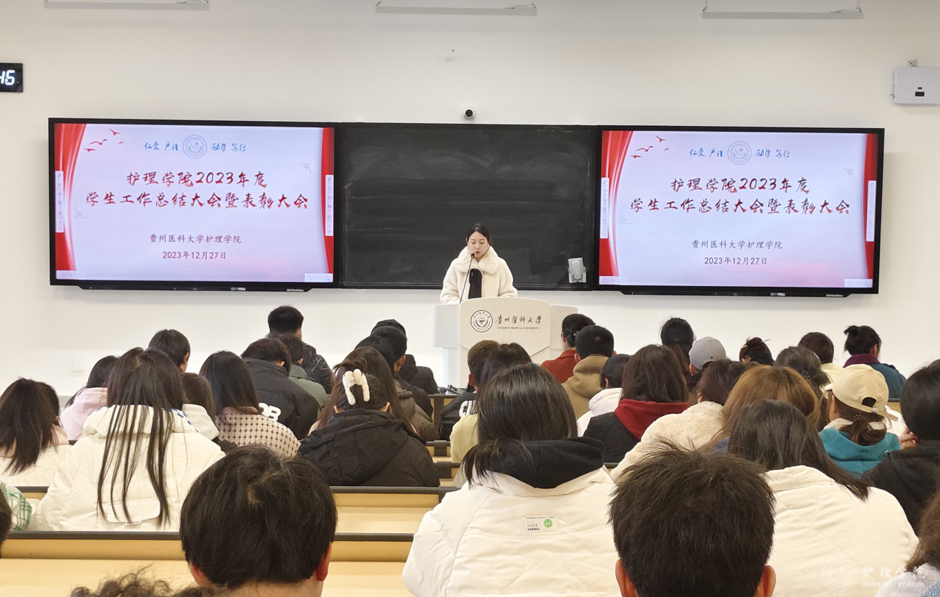 张黎从党团建设、学生日常管理、专项工作、社会实践、校园文化活动以及学生工作获奖等方面对学院2023年学生工作进行了全面的总结。学生管理科副科长毕丽宣读了先进集体和优秀个人受表彰名单。2022级护理学朱月成同学作为学生代表发言,他分享了自己参加学生管理工作、各类科研比赛以及社会实践活动的经历,号召同学们要增强作为护生的责任感和使命感。