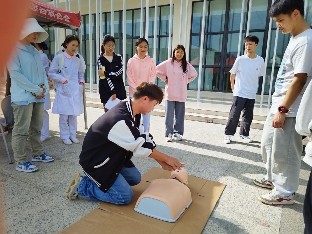 活动分为三个环节。第一环节为“学习手卫生+戴脱无菌手套”,活动中,同学们积极参与,深刻认识到正确戴脱无菌手套和保持手卫生不仅是对患者负责,也是对医护人员的自身安全负责。第二环节为“CPR(胸外心脏按压)”,活动现场,同学们认真聆听和学习“CPR”急救操作的教学过程,充分认识到了掌握急救知识的重要性。第三环节为 “海姆立克急救操作”,异物卡在喉咙里极易出现生命危险,正确的掌握海姆立克急救知识,可以让同学们在遇到紧急情况时临危不惧、冷静处理,活动中同学们认真练习,取得了良好的学习效果。
