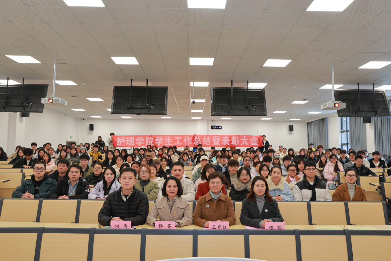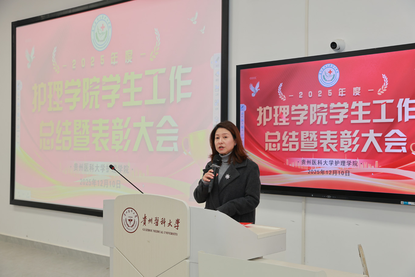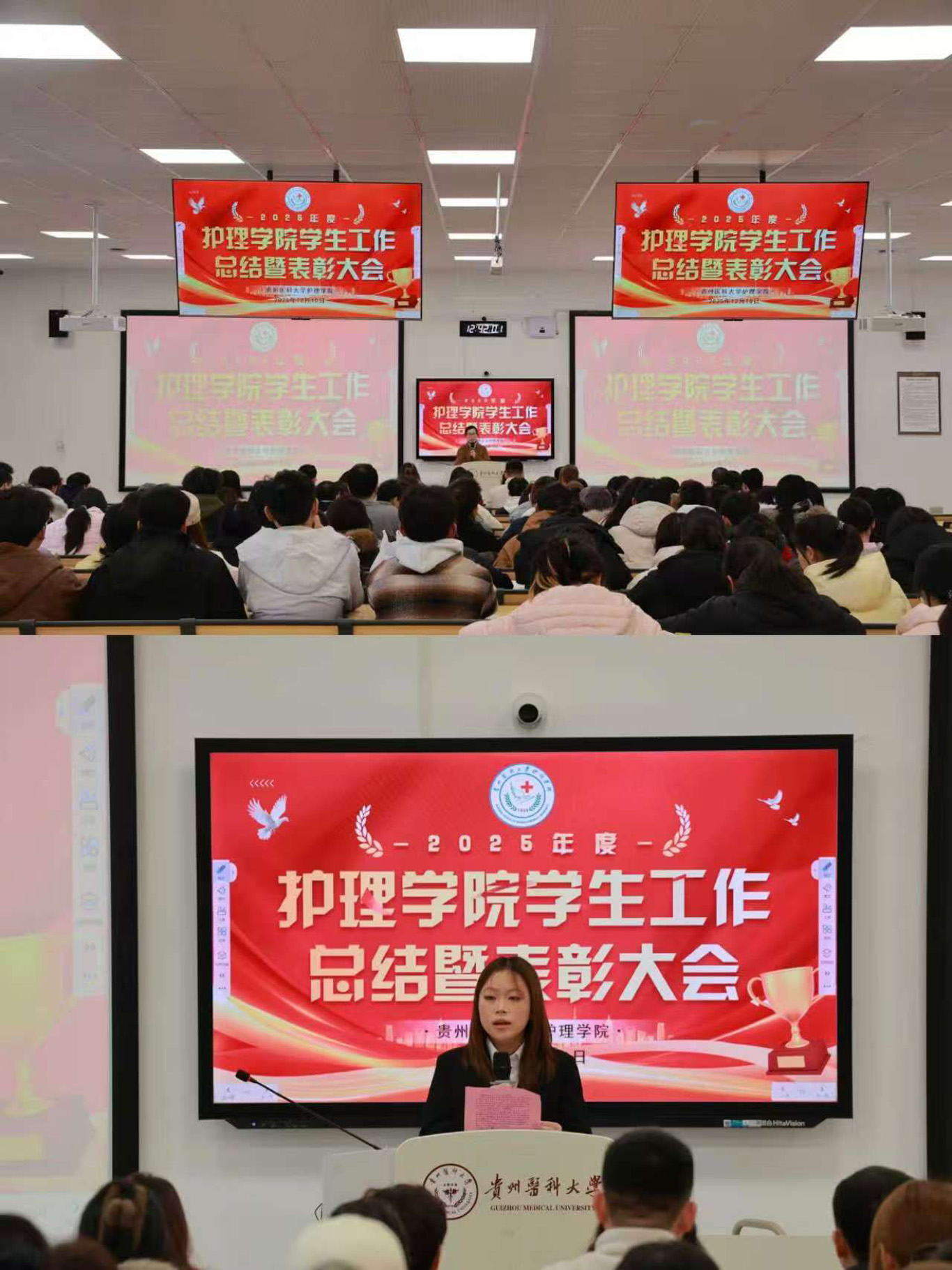 杨英作总结讲话。她首先向受到表彰的集体与个人致以热烈祝贺,向辛勤耕耘在学生工作一线的教职工表示衷心感谢。随后,她以“贵医护理的历史传承与时代成就”为切入点,带领师生回顾学院发展历程,引导同学们厚植专业情怀;围绕“坚定新征途、凝聚成长力量”,强调以专业情怀滋养个人成长,将个人发展融入学院建设与行业发展大局。杨英对全体同学提出三点要求:一是坚守医者情怀,涵养仁心大爱;二是坚持勤学不辍,锤炼过硬本领;三是勇于直面挫折,永葆奋进姿态。