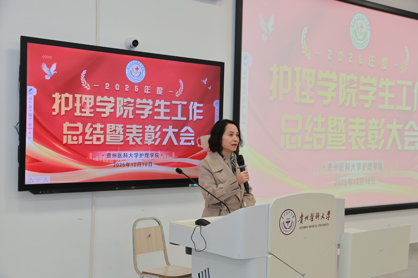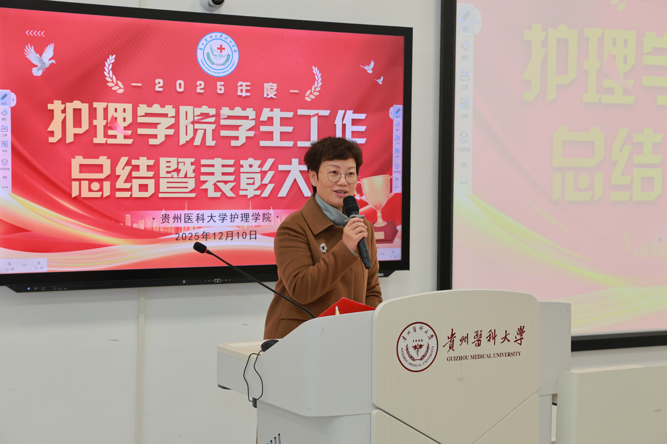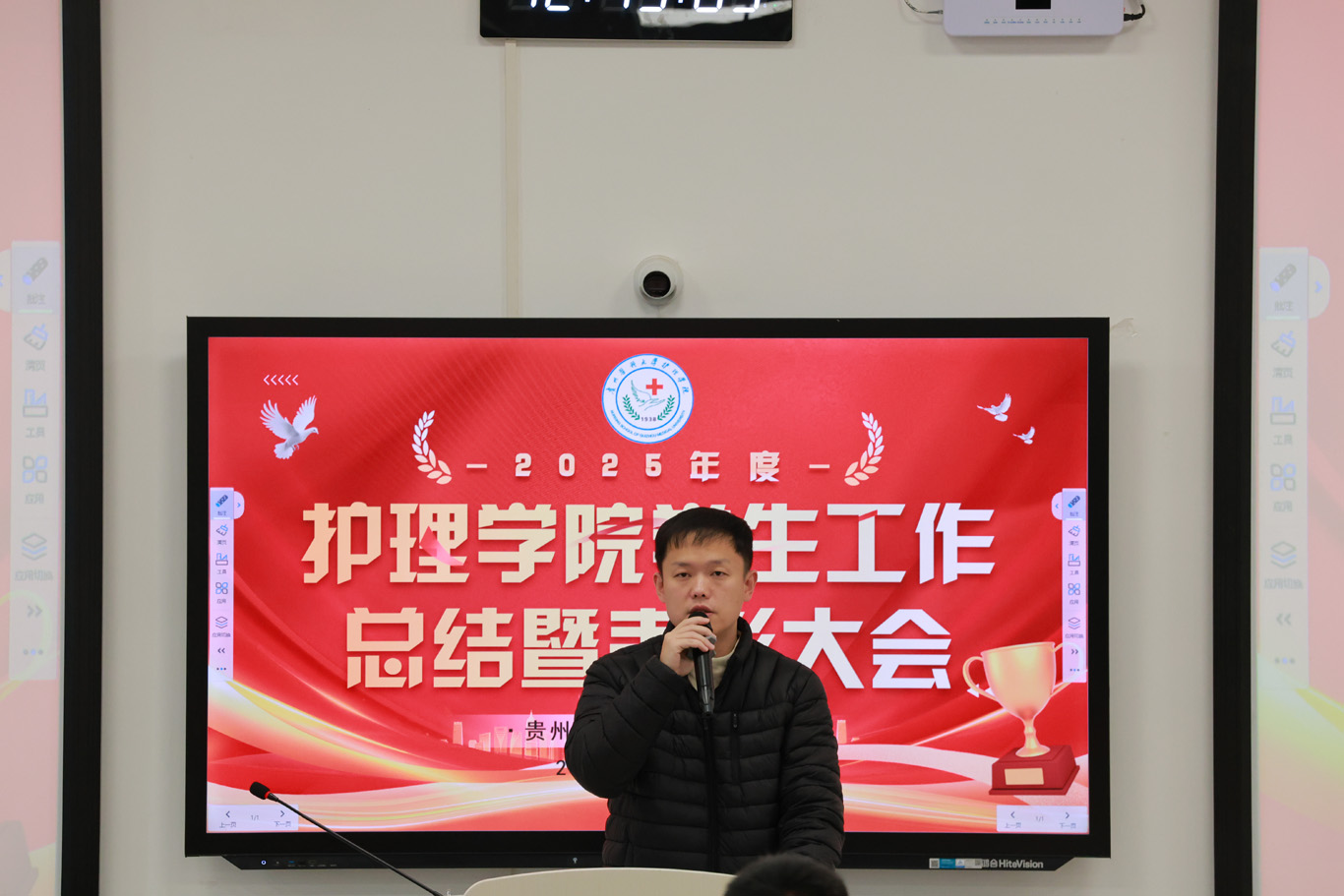 杨英作总结讲话。她首先向受到表彰的集体与个人致以热烈祝贺,向辛勤耕耘在学生工作一线的教职工表示衷心感谢。随后,她以“贵医护理的历史传承与时代成就”为切入点,带领师生回顾学院发展历程,引导同学们厚植专业情怀;围绕“坚定新征途、凝聚成长力量”,强调以专业情怀滋养个人成长,将个人发展融入学院建设与行业发展大局。杨英对全体同学提出三点要求:一是坚守医者情怀,涵养仁心大爱;二是坚持勤学不辍,锤炼过硬本领;三是勇于直面挫折,永葆奋进姿态。