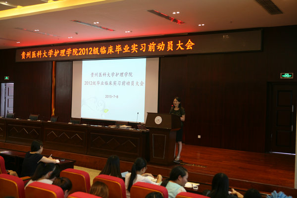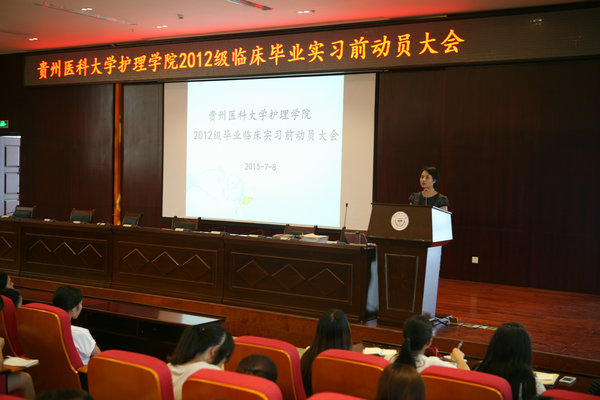 为了帮助学生做好进入临床实习心理准备,确保毕业实习工作顺利进行,BEAT365英国官网于2015年7月8日下午在花溪校区道德讲堂召开了临床毕业实习前动员大会,BEAT365英国官网党委副书记杨英、副院长刘志燕、学生科科长曾敏、办公室副主任张常喜、辅导员毕丽及2012级本科班学生参加了此次大会。会议由生产实习科科长柳忠燕主持。