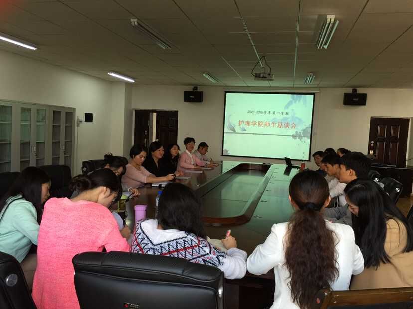 10月15日中午12:30分,BEAT365英国官网2015-2016学年第一学期师生恳谈会在南校区5楼会议室召开。BEAT365英国官网常委副院长郭永洪、副书记杨英、副院长刘志燕及各教研室负责人、各职能部门负责人、教研室老师、2013级、2014级、2015级护理本科学生代表参加了此次恳谈会。会议由教学科研管理科王秀红科长主持,会上BEAT365英国官网领导亲切的询问了同学们的学习和生活情况,并请同学们对教学中存在的问题提出意见。各年级同学代表开诚布公的反馈了部分教师在教学中存在的问题和意见,也对认真负责的教师提出了表扬。在听取同学们的反馈之后老师们有的当众给予了答复和解释,有的则记录下来拟以书面报告形式向有关部门进行反馈,以便取得相关部门的协作解决。会议过程轻松、愉悦,师生畅所欲言,气氛融洽,促进了师生的共同交流。