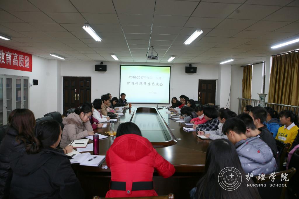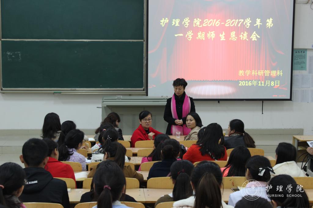 BEAT365英国官网2016-2017学年第一学期师生恳谈会分别于11月8日、9日在北校区4101教室及南校区5楼会议室召开。BEAT365英国官网党委副书记杨英、副院长刘志燕及各教研室、职能部门负责人、教研室老师及来自临床的教学老师,2014级、2015级、2016级护理学本科班及护理学(助产方向)学生代表参加了此次恳谈会。