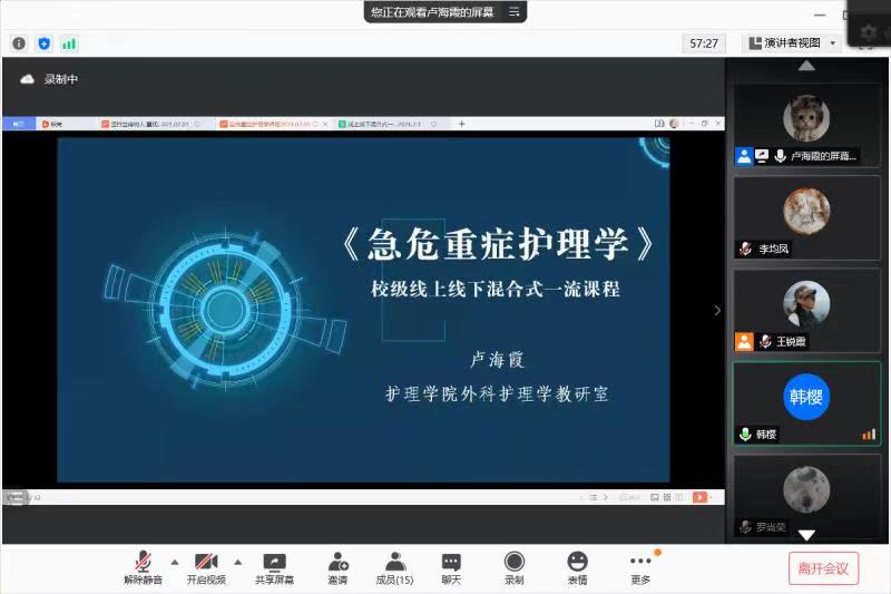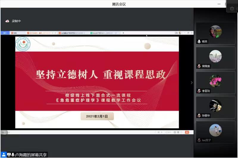 2月1日,外科护理学教研室通过腾讯会议召开2020-2021学年第二学期《急危重症护理学》校级线上线下混合式一流课程教学工作会议,本次会议的主题为《坚持立德树人,重视课堂思政》。会议由外科护理学教研室副主任韩樱主持,院党委书记杨英、院长李亚玲及《急危重症护理学》15名授课教师参加此次会议。