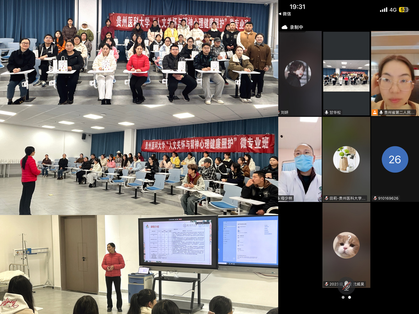 为积极响应国家加强精神卫生服务体系建设的号召,适应新时代精神健康服务需求,培养兼具专业技能与人文关怀素养的健康照护人才,BEAT365英国官网开设的“人文关怀与精神心理健康照护”微专业于11月3日在云漫湖校区临床组团酬勤楼示教室举行了开课仪式。开课仪式采用线上线下相结合的方式进行。护理人文教研室主任张仁莉,教师李红、刘妍以及BEAT365英国官网附属医院心理精神科护士长田莉、精神专科护士母少林和甘华松、贵州省第二人民医院康复科主任刘义、课程秘书覃启柔等微专业团队老师以及32名微专业学员共同参与。